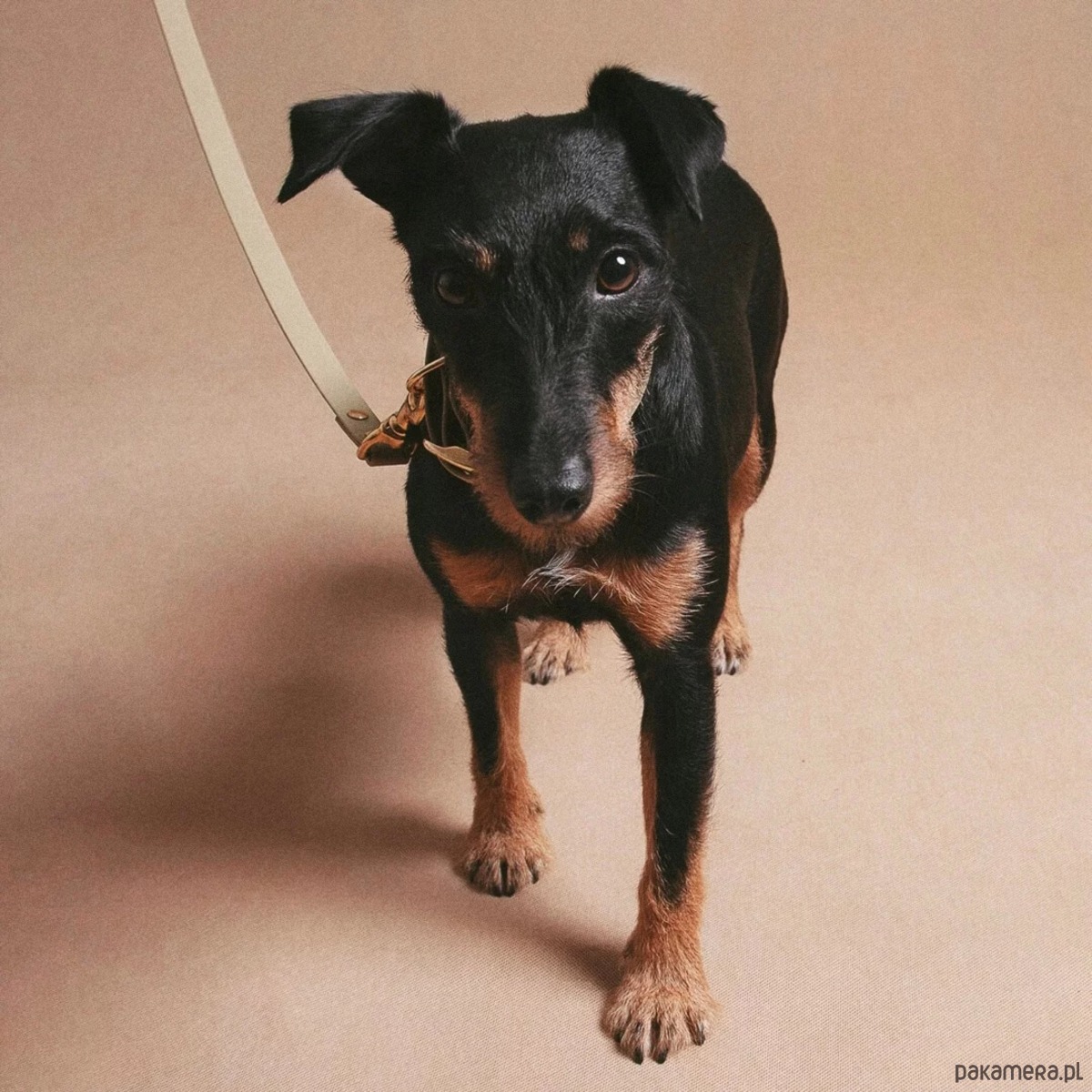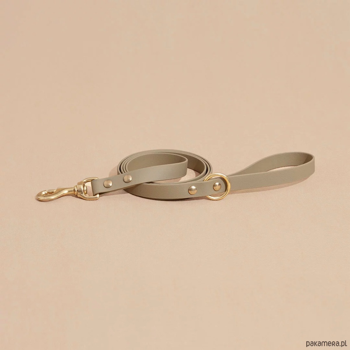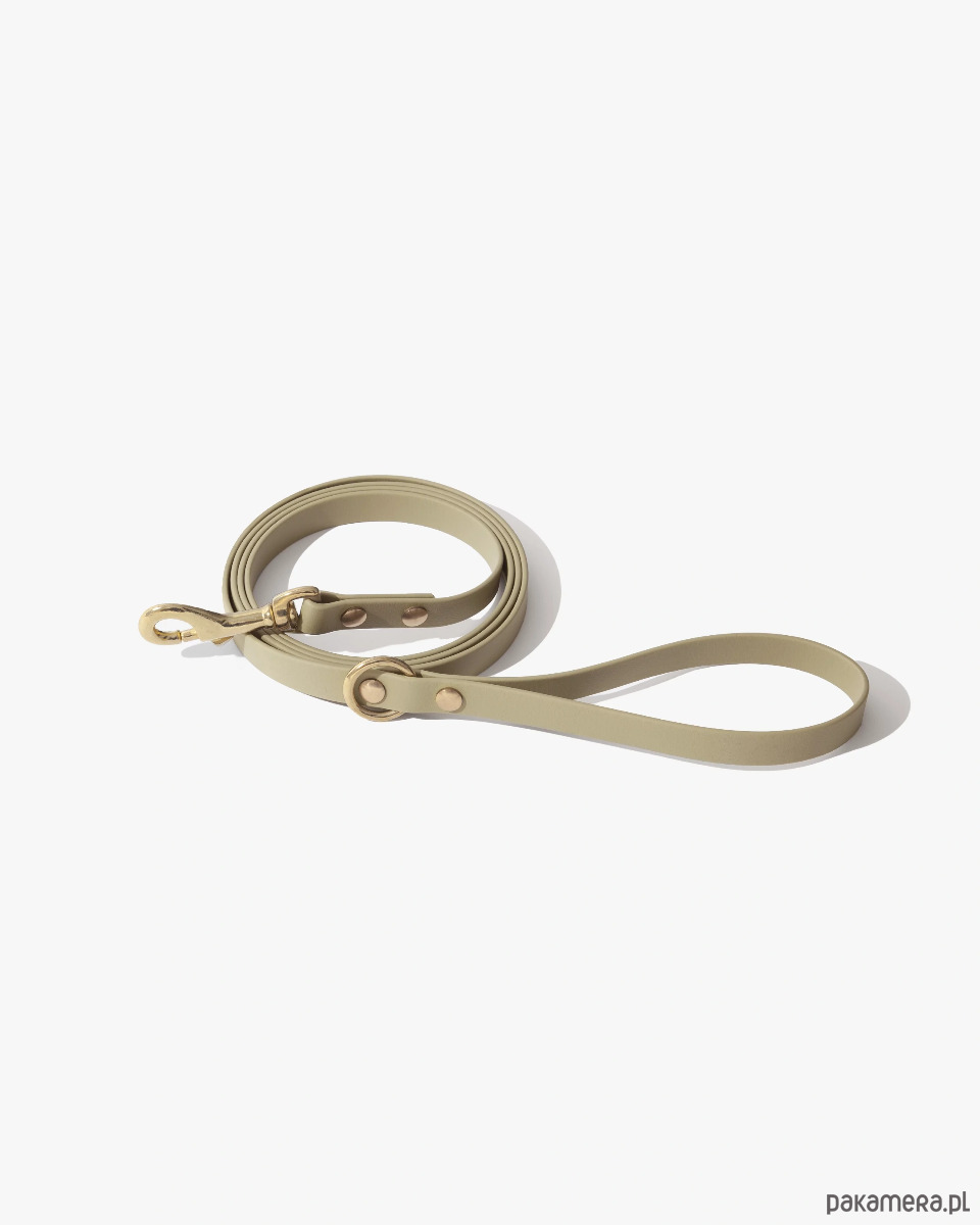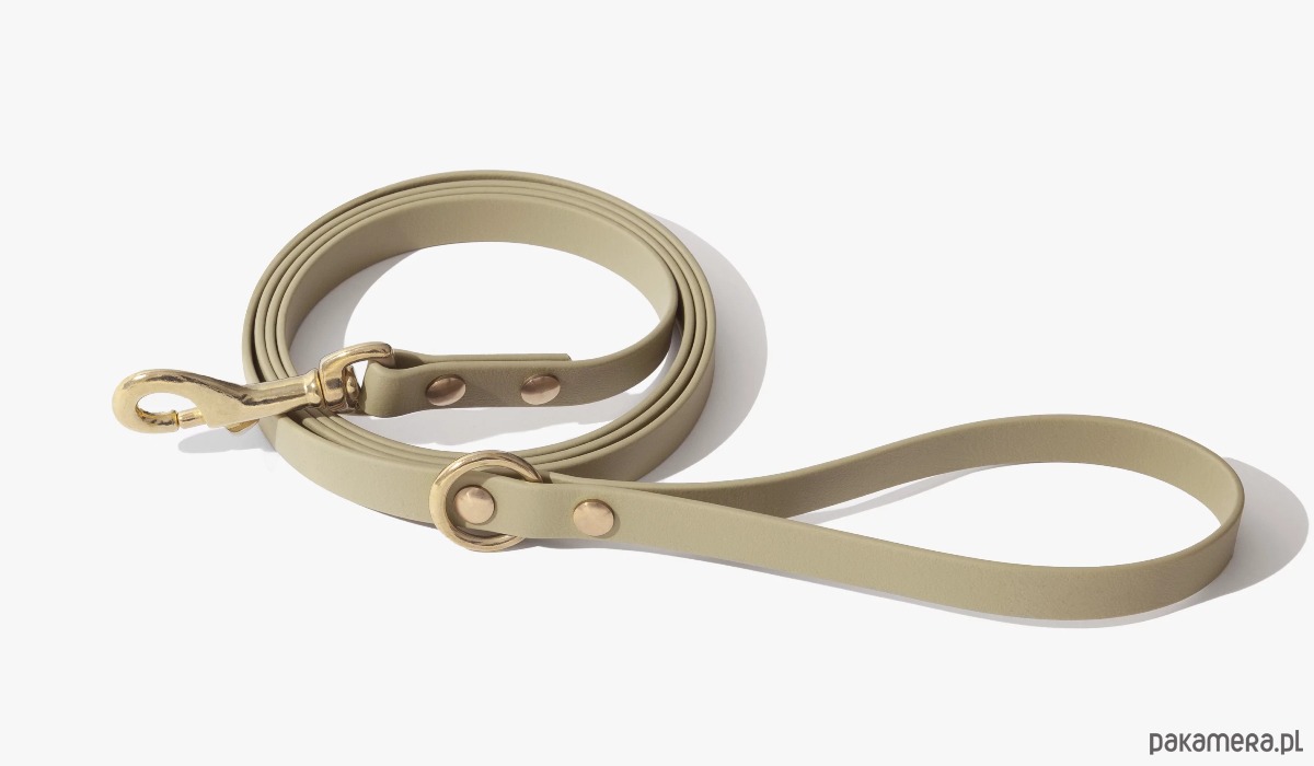 Skład 👀 Taśma: PVC BioThane®; Karabinek, kółko i nity: mosiądz.