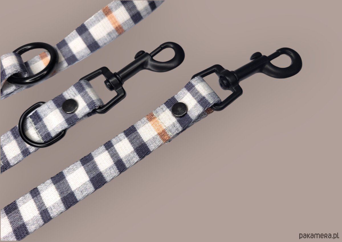 Smycz wykończona jest metalowymi okuciami w kolorze czarnym, posiada dwa karabińczyki oraz półkole do którego można doczepić etui na woreczki.