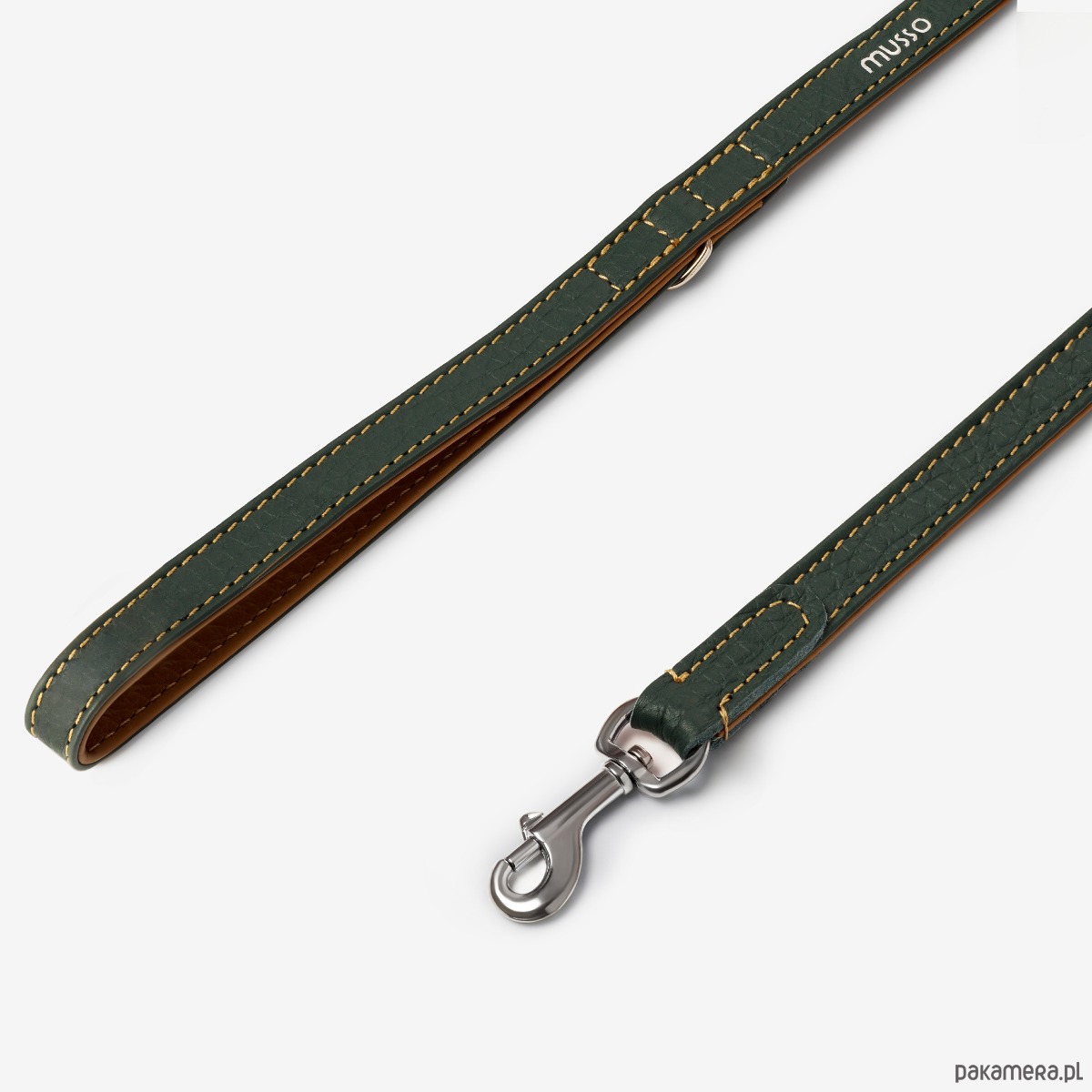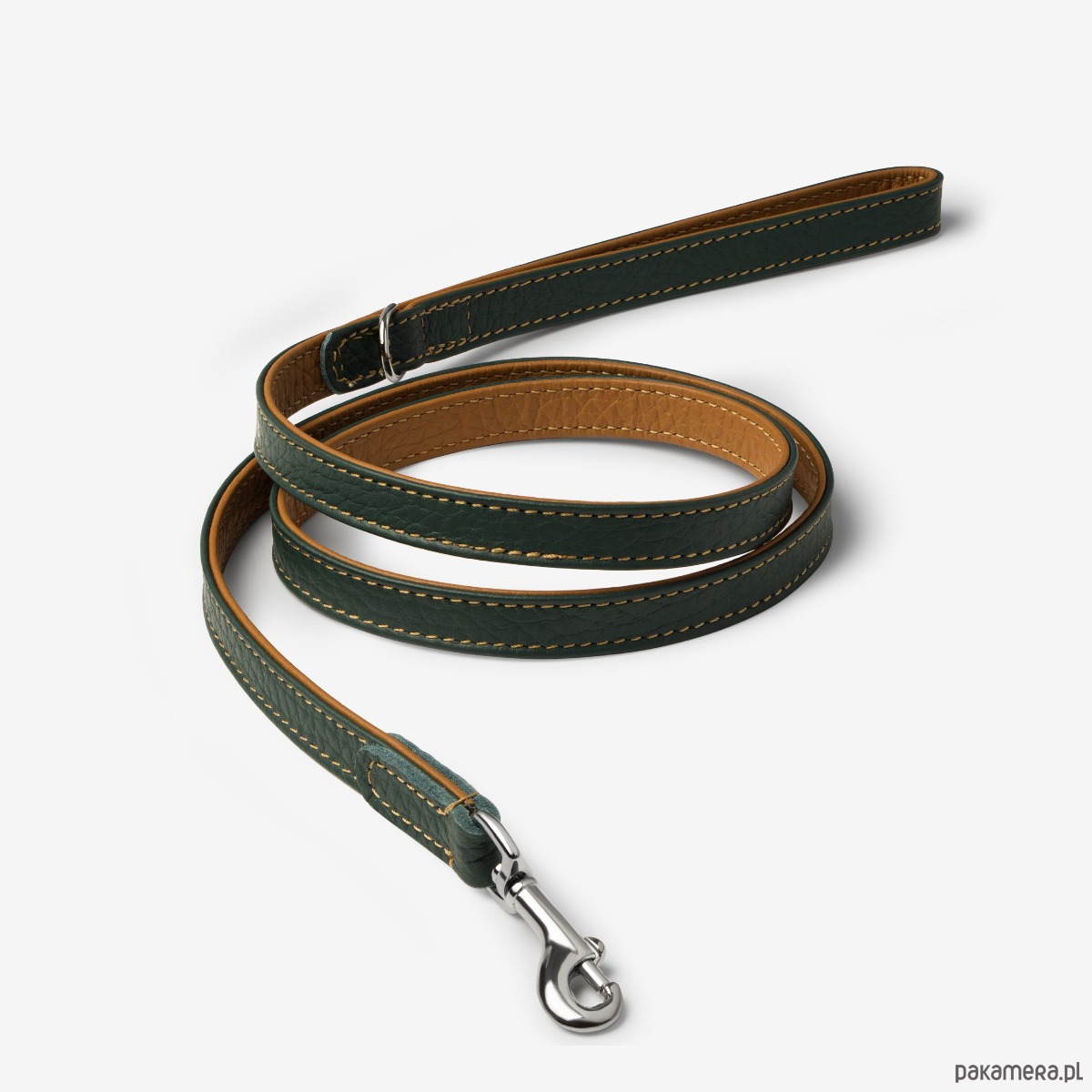 Smycz Duo Terra to głęboka, ziemista paleta – łącząca butelkową zieleń z ciepłym, piaskowym tonem. Stworzona z naturalnej, ziarnistej skóry włoskiej, doskonale wpisuje się w estetykę natury i nowoczesnego minimalizmu.