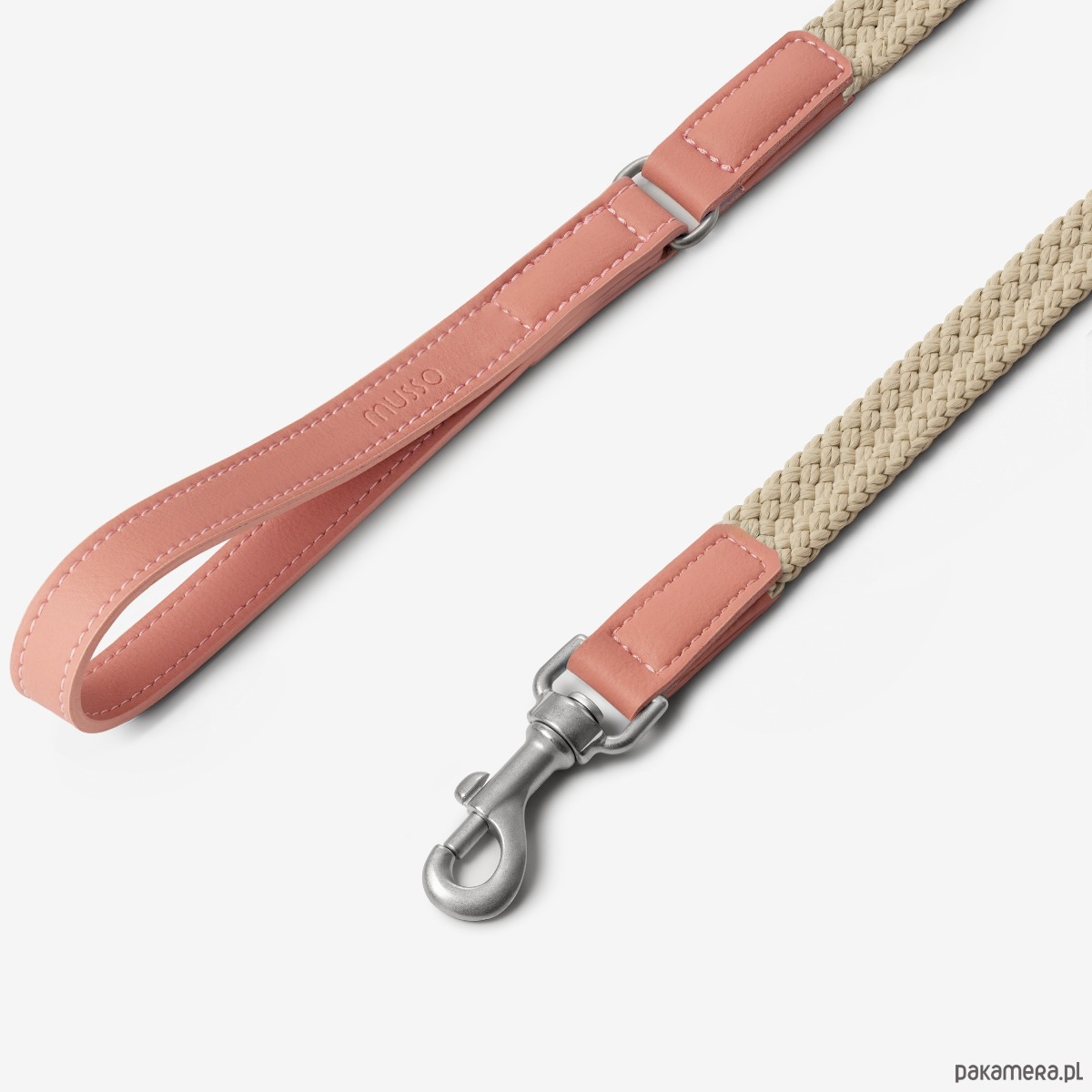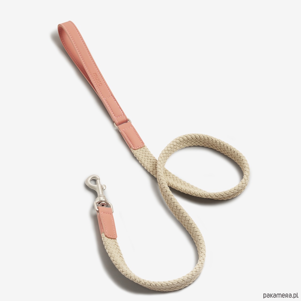 Smycz Nodo Cipria to połączenie nowoczesnego designu i funkcjonalności, stworzone z myślą o codziennym komforcie oraz estetyce. Wykonana z wytrzymałego sznura polipropylenowego w odcieniu beżu oraz wykończona wegańską skórą Apple Leather w subtelnym, pudrowo-różowym kolorze.