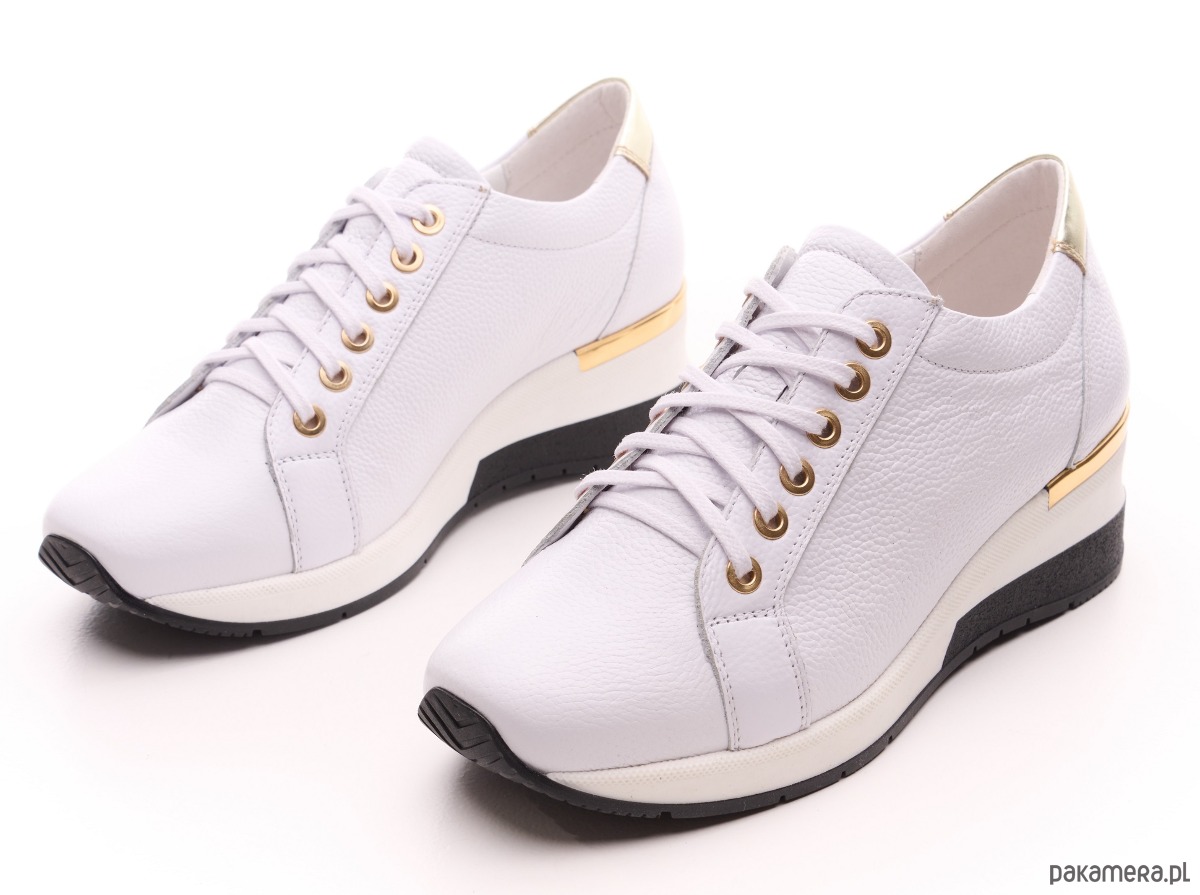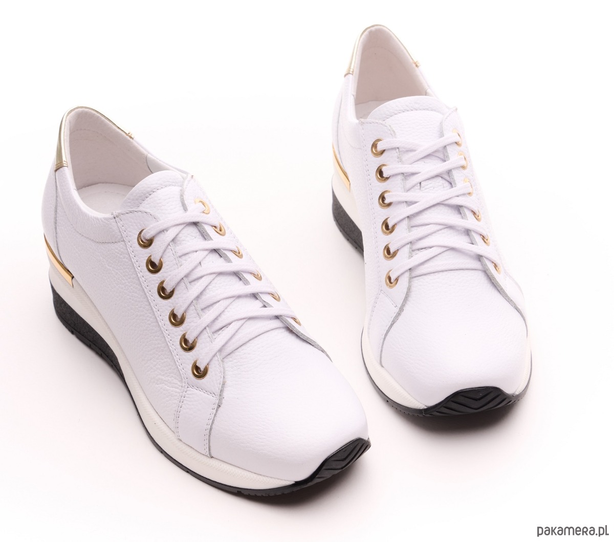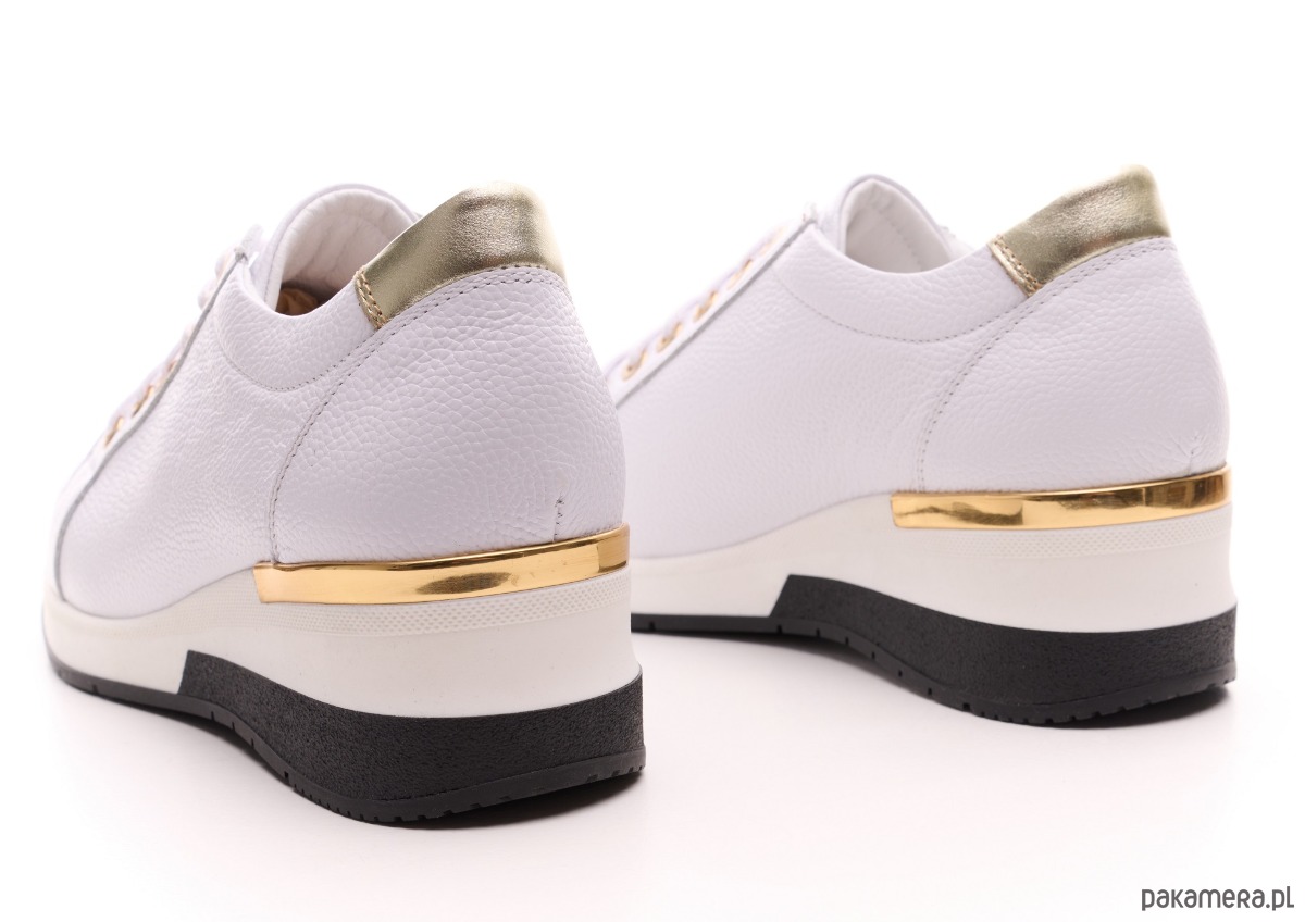 Podwyższona podeszwa ze złotą wstawką, nosek zaokrąglony, zabezpieczony gumą.