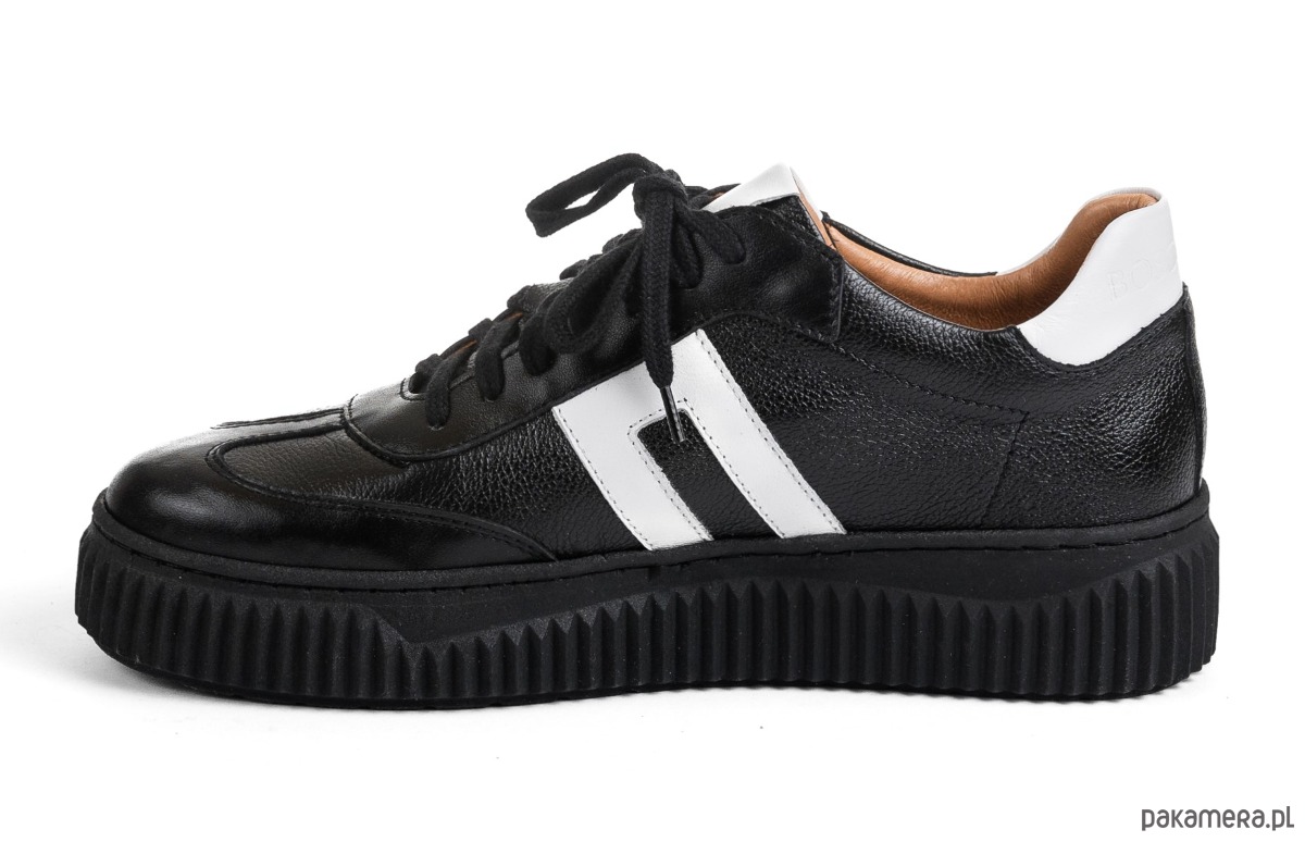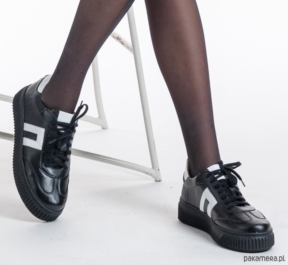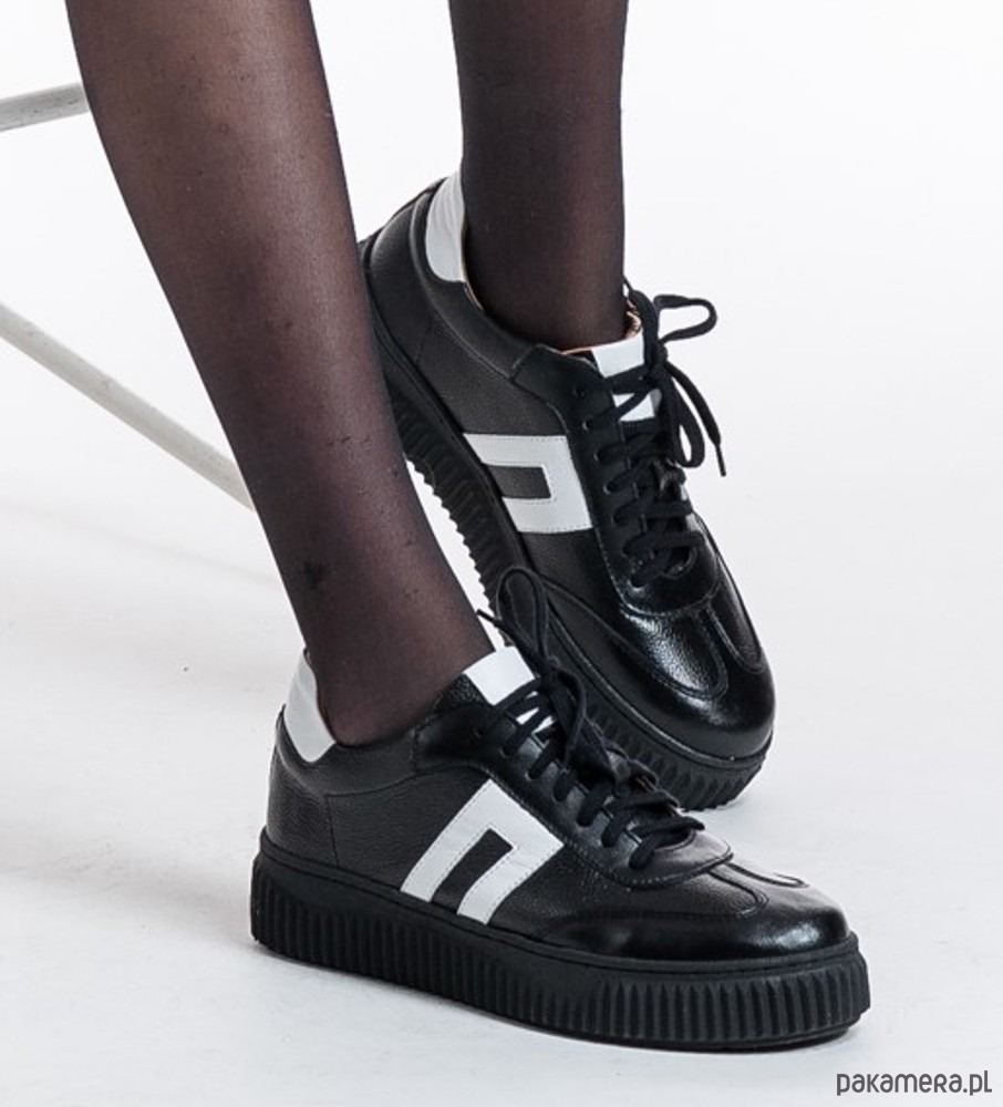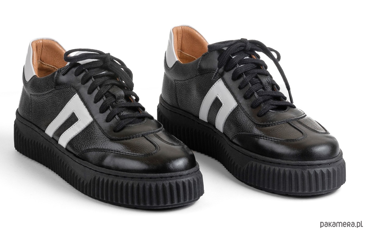 Sneakersy skórzane - czarne + białe wstawki (7188)