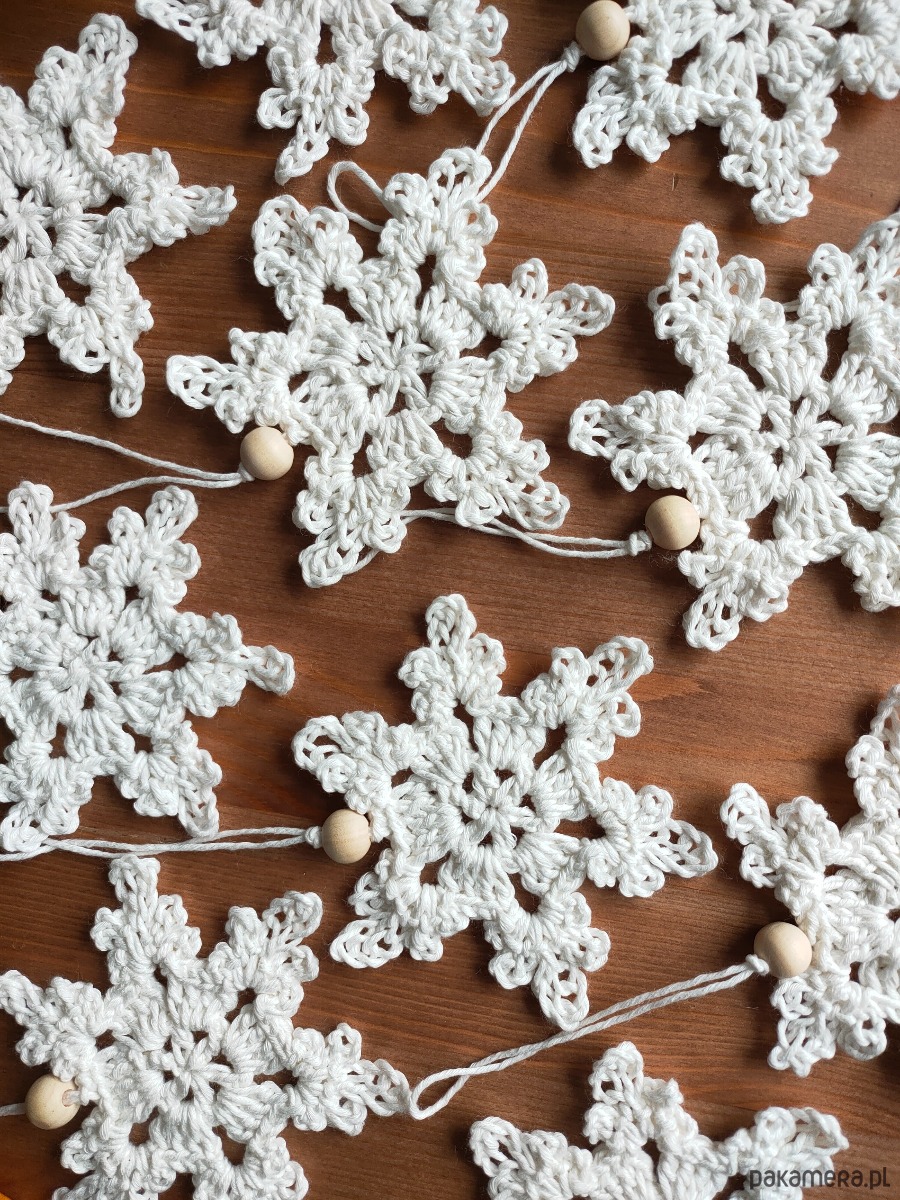 Śnieżynki wykonane na szydełku z bawełnianego sznurka z drewnianym koraliczkiem.