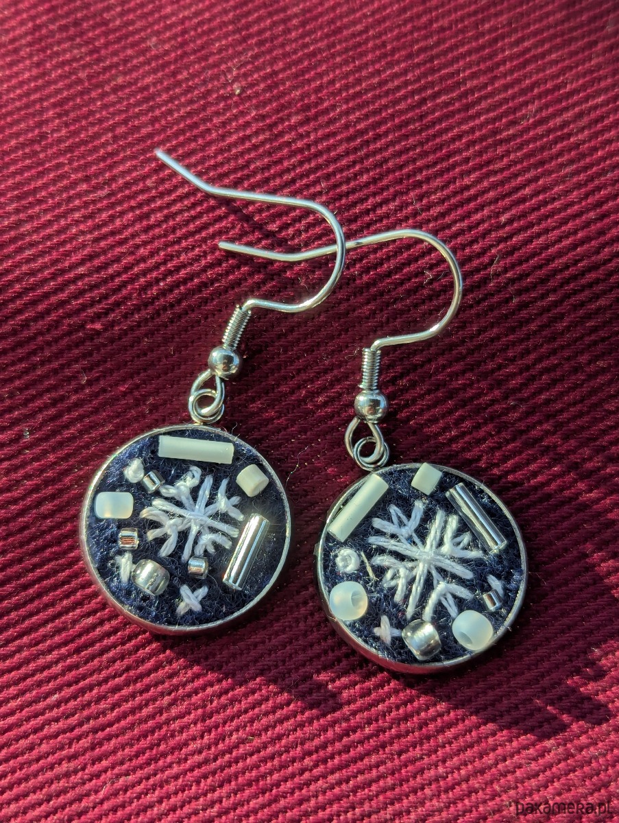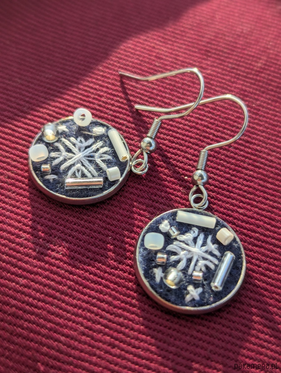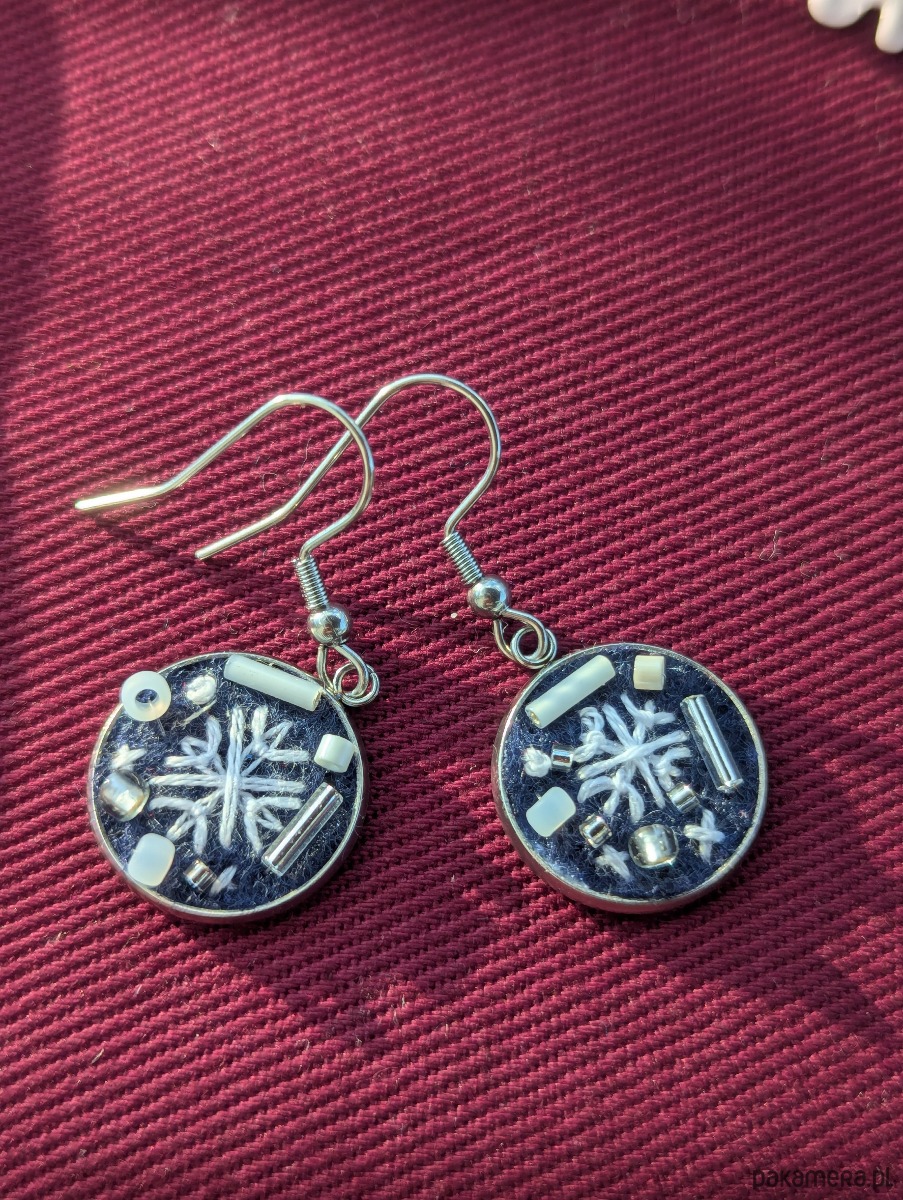 Śnieżynki - ręcznie haftowane kolczyki wiszące z koralikami