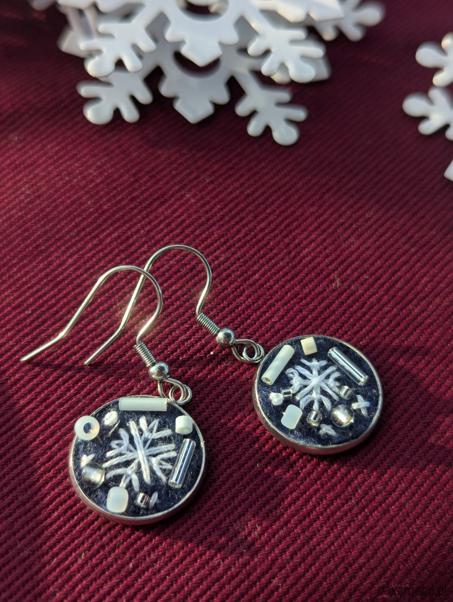 Te urocze kolczyki-snieżynki powstały dzięki ręcznie wykonanemu haftowi na filcu. Każdy kolczyk został ozdobiony drobnymi, lśniącymi koralikami, tworząc subtelny efekt skrzącego się śniegu.