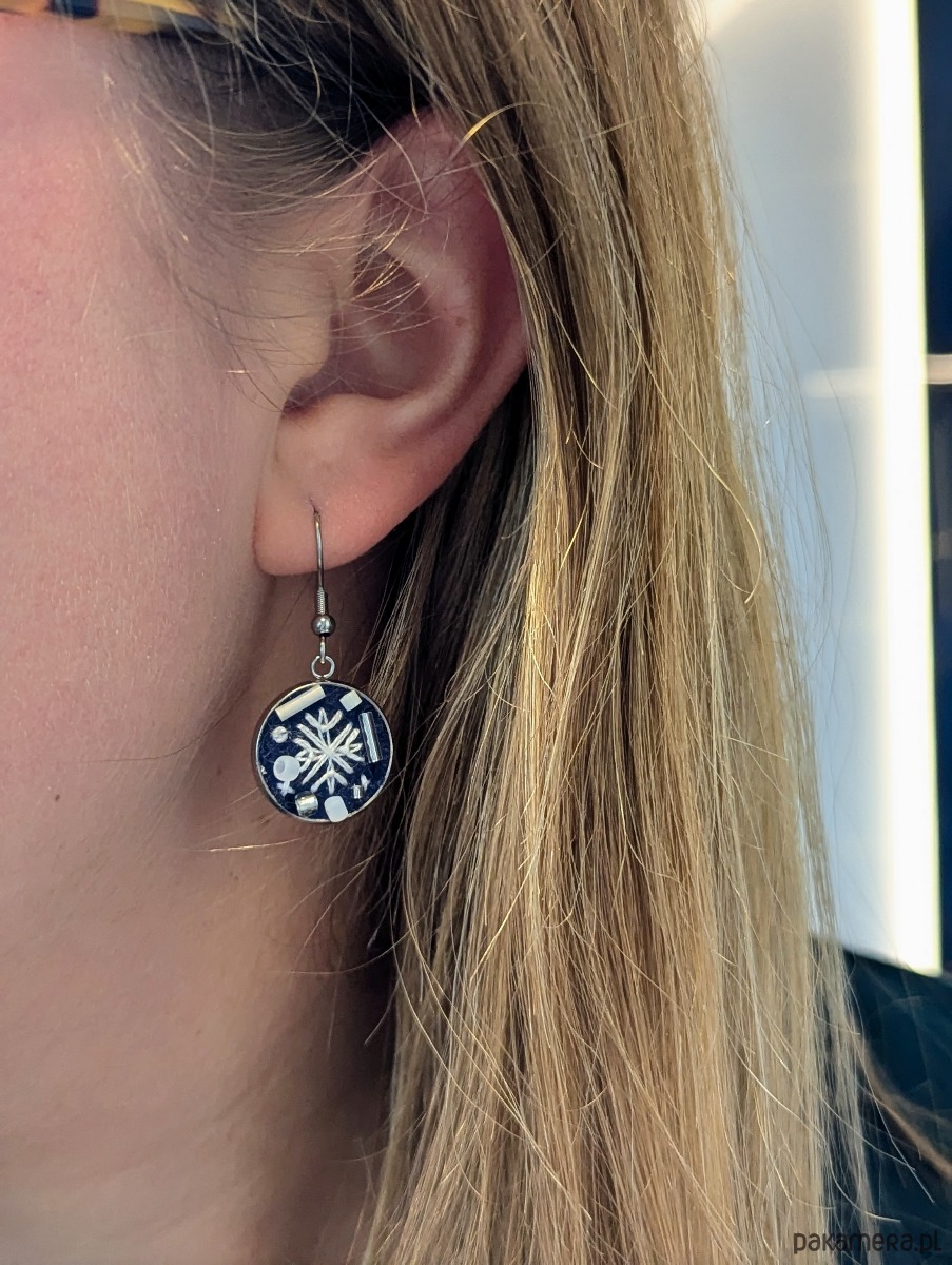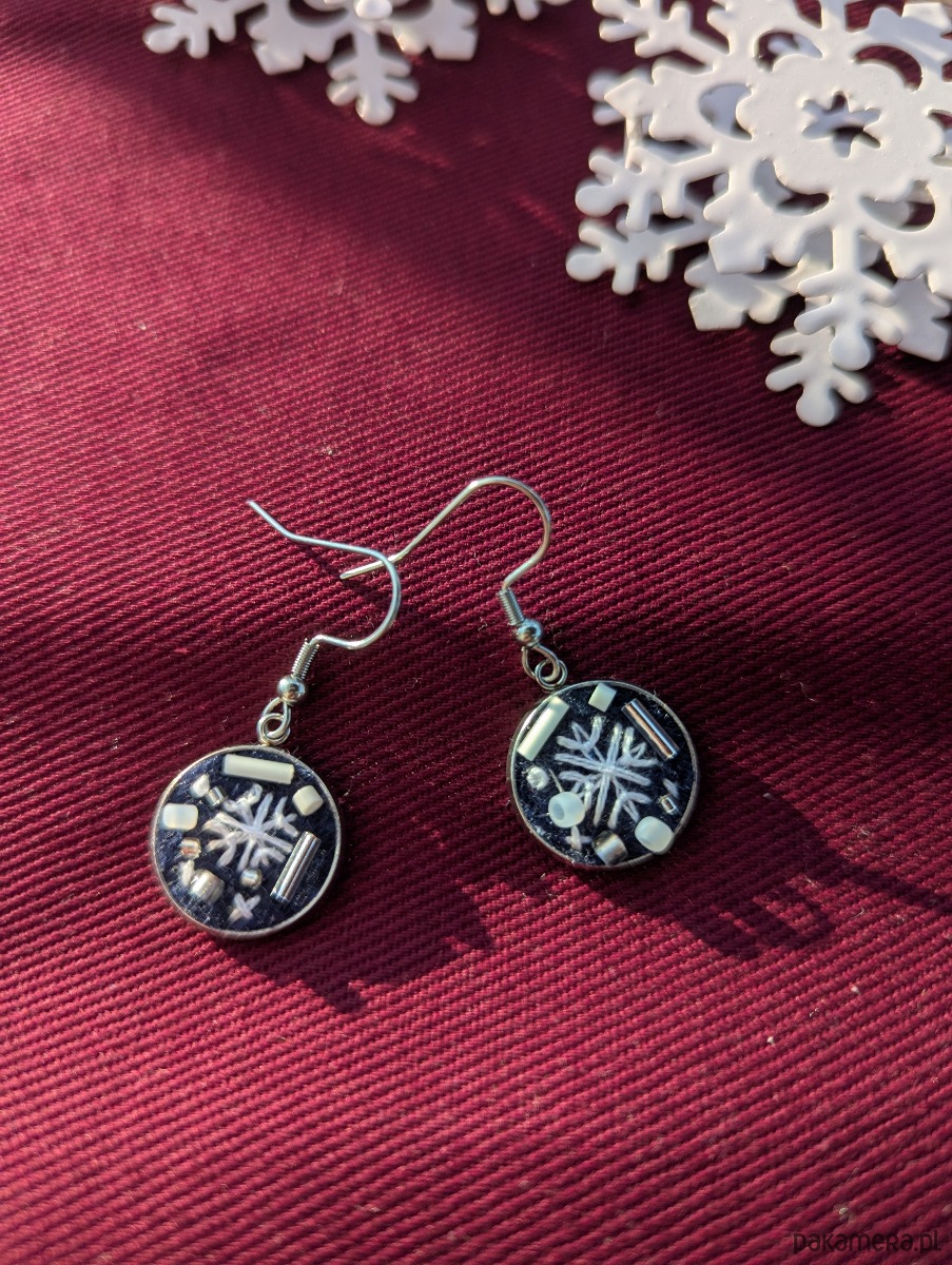 Kolczyki są delikatne, a jednocześnie przyciągają wzrok elegancją i rękodzielniczą precyzją. Idealnie pasują do zimowych stylizacji, dodając im uroku i świątecznej magii.