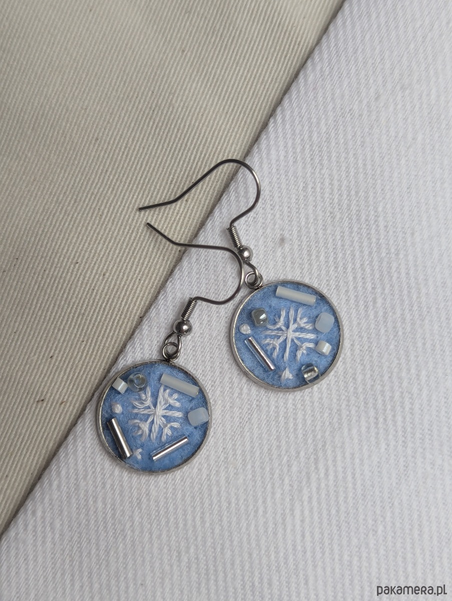 Śnieżynki - ręcznie haftowane kolczyki wiszące z koralikami