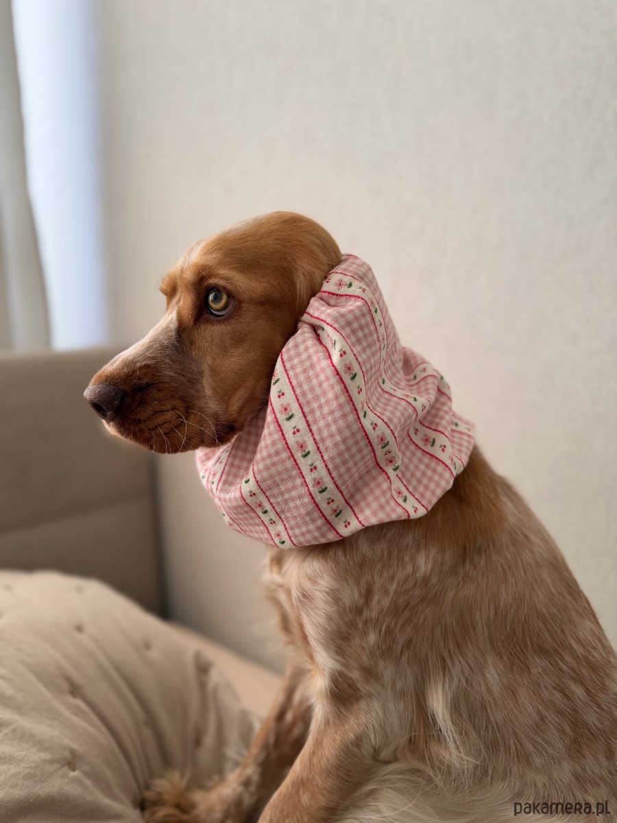 Snood - ochraniacz na uszy dla psów ras z długimi uszami np cocker spaniel angielski springer spaniel lub takich które potrzebują ochrony szyi. Wykonany z lekkiego, przewiewnego bawełnianego muślinu. Idealny na lato. Posiada regulację z obu stron. Gumka plus stopery. Wymiary podane zostały na zdjęciach.