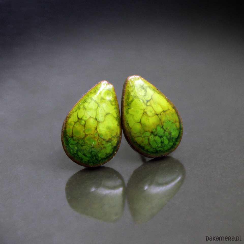 Ceramiczne kolczyki w formie sztyftów, ręcznie wykonane z delikatnej czekoladowobrązowej gliny kamionkowej, jednostronnie szkliwione mieszanką zielonych i błękitnych szkliw z efektem plamek, na antyalergicznych sztyftach w kolorze srebrnym. Długość ok. 13mm. Polecam