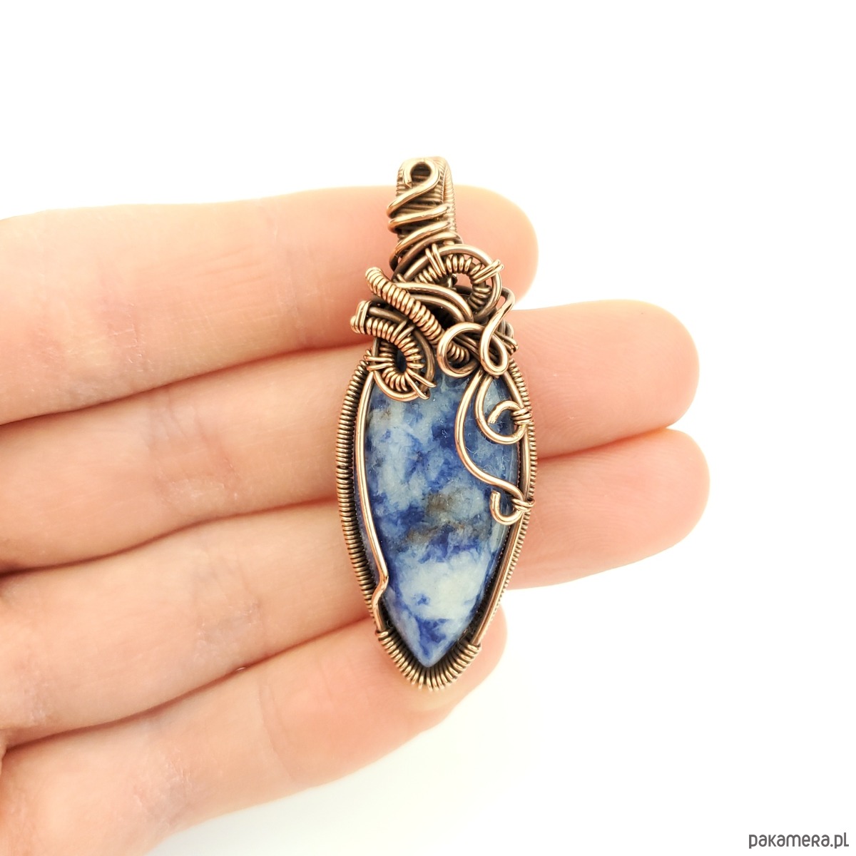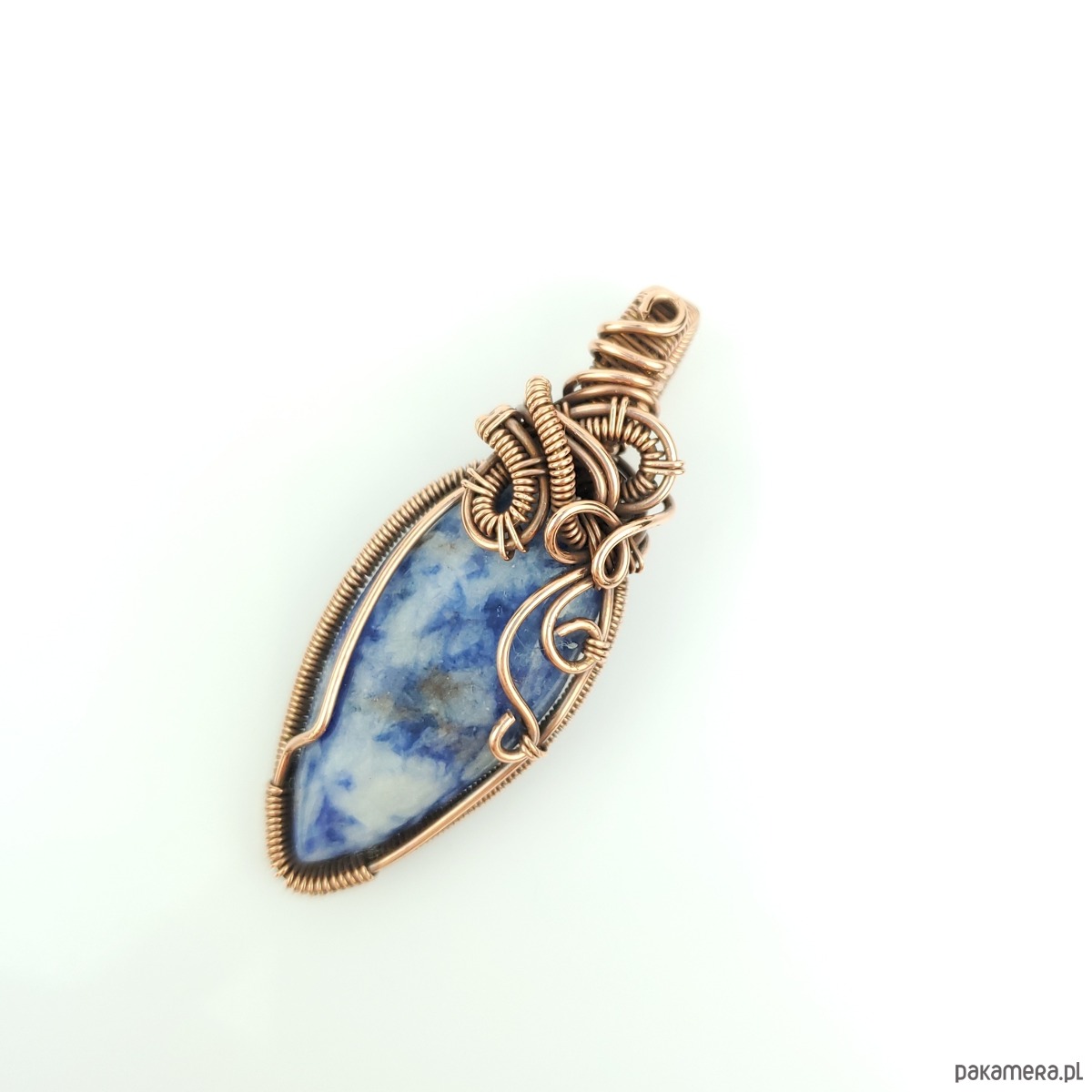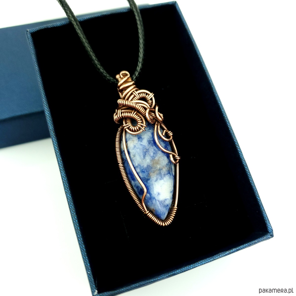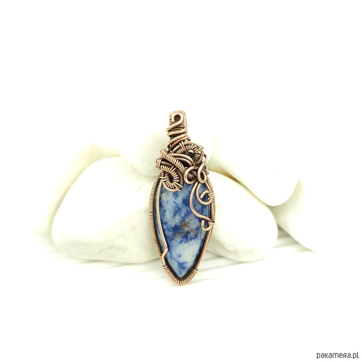 Wisiorek powstał z kamienia sodalitu, całość misternie opleciona miedzią. Biżuteria oksydowana.