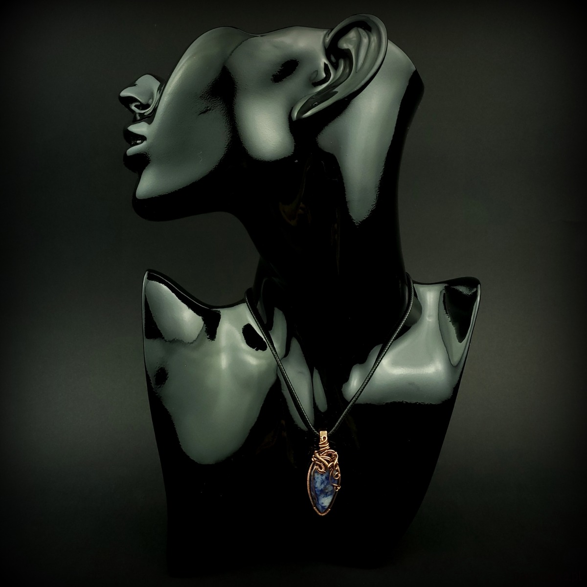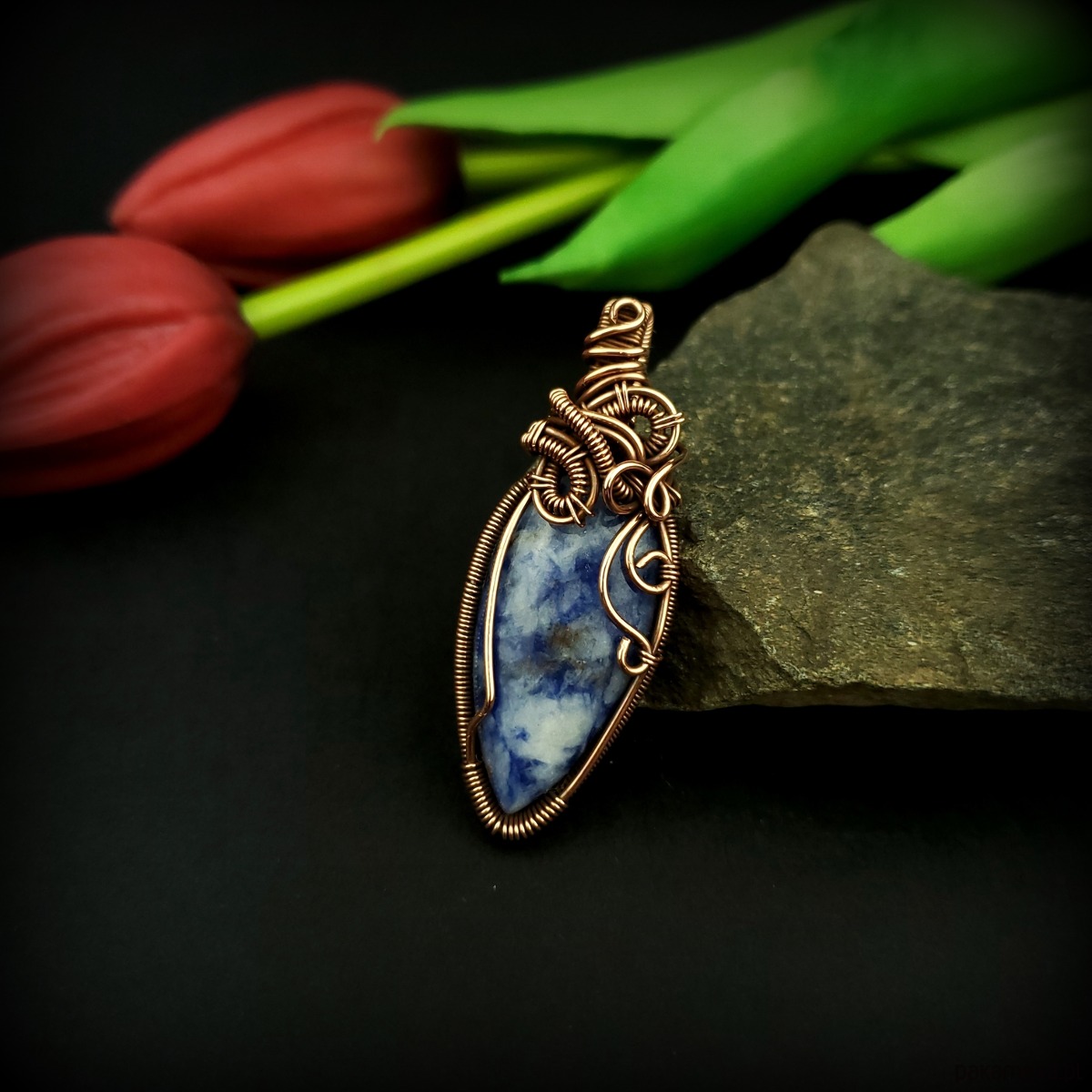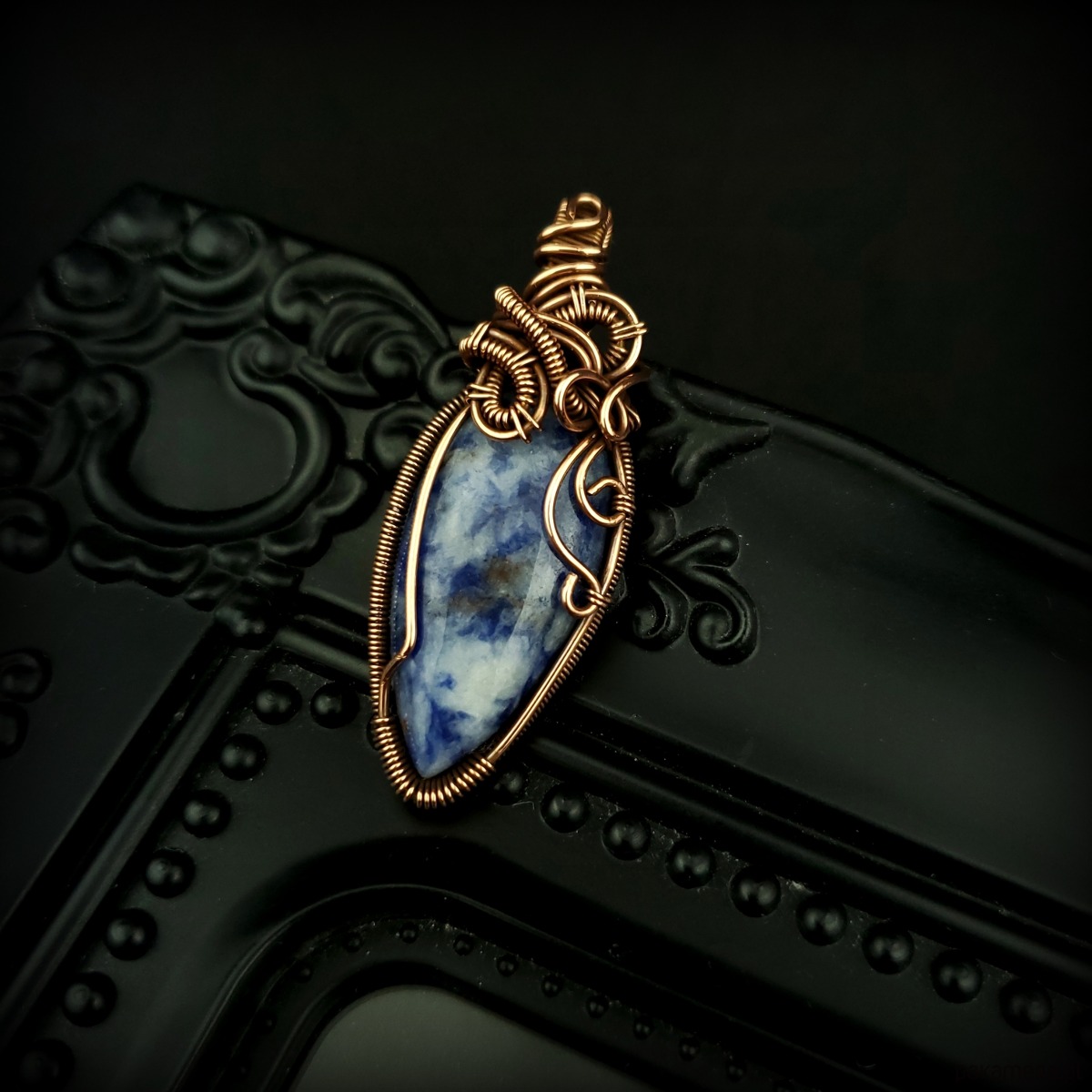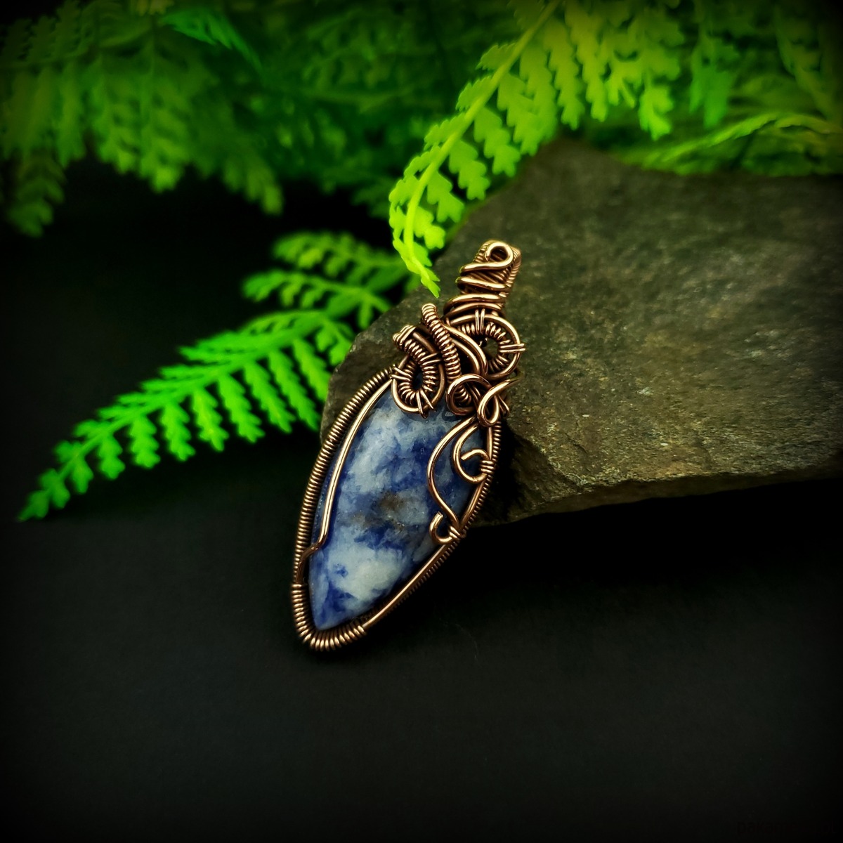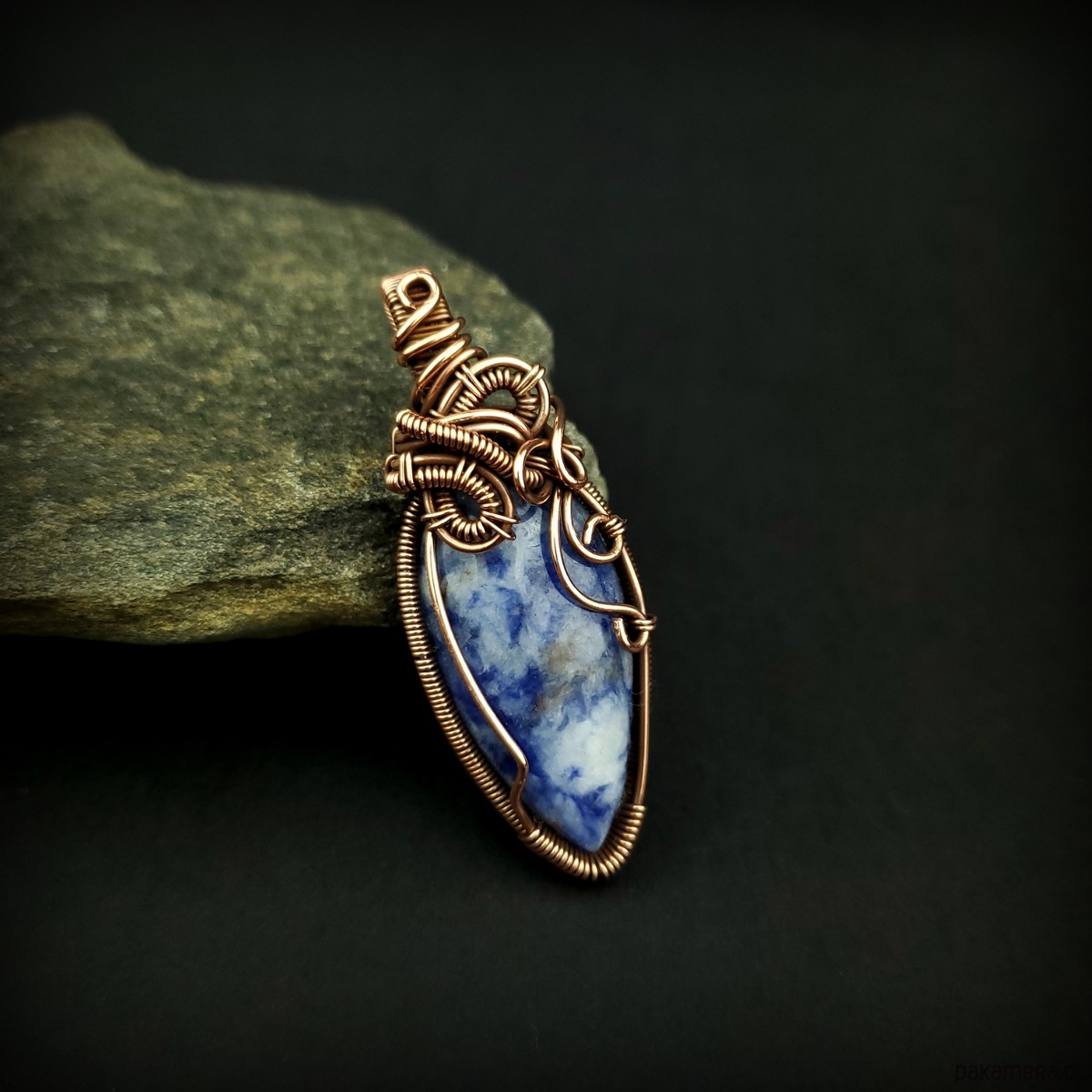 Wisiorek powstał z kamienia sodalitu, całość misternie opleciona miedzią. Biżuteria oksydowana.