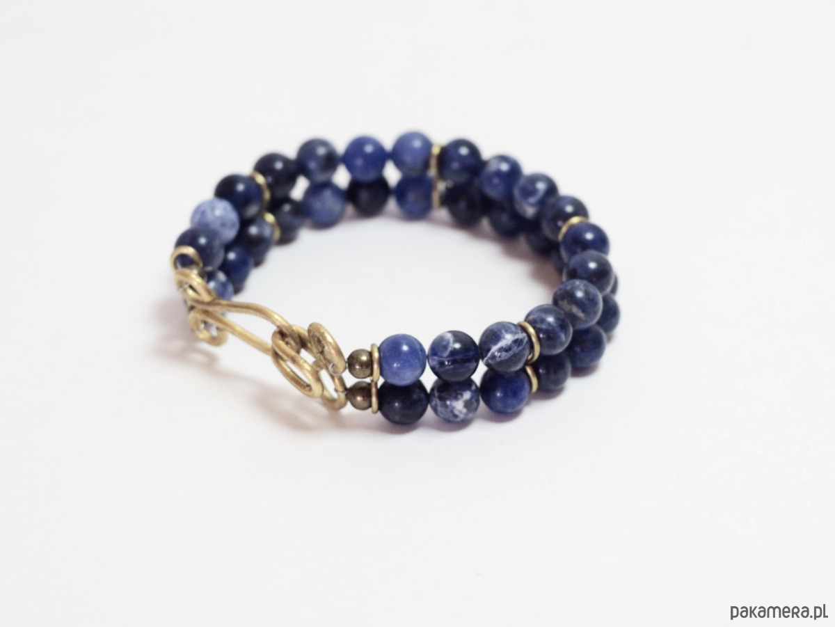 Bransoletka z sodalitów. Ręcznie kute, mosiężne zapięcie, z efektem młoteczkowania. Kulki mają średnicę 8 mm. Całkowita długość 20 cm. Po zapięciu jest krótsza o około 3 mm. Idealna na rękę o obwodzie (mierzona tuż za nadgarstkiem) 17,5 - 18,5 cm. Jest możliwość zamówienia w innym rozmiarze. Zapraszam do kontaktu.