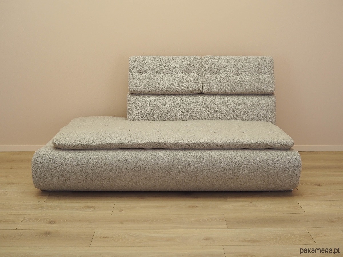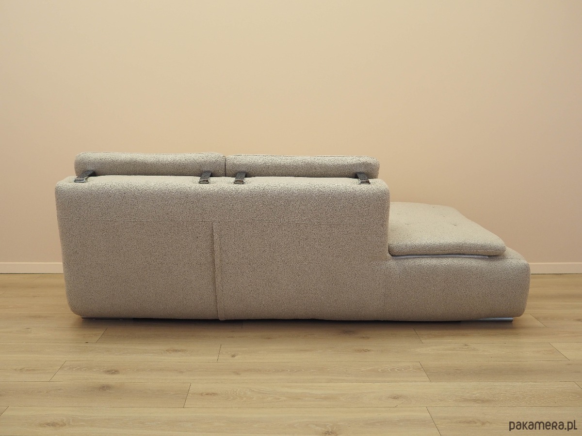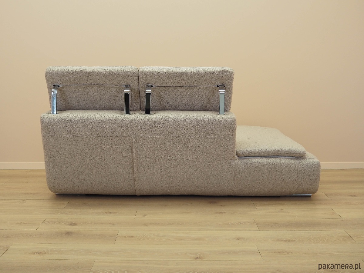 Nogi mebla wykonane z metalu. Sofa została poddana renowacji tapicerskiej, gąbki oraz tkanina wymienione na nowe. Wykorzystana została wysokogatunkowa tkanina w kolorze beżowym. Dodatkowym atutem jest możliwość regulacji wysokości zagłówka.