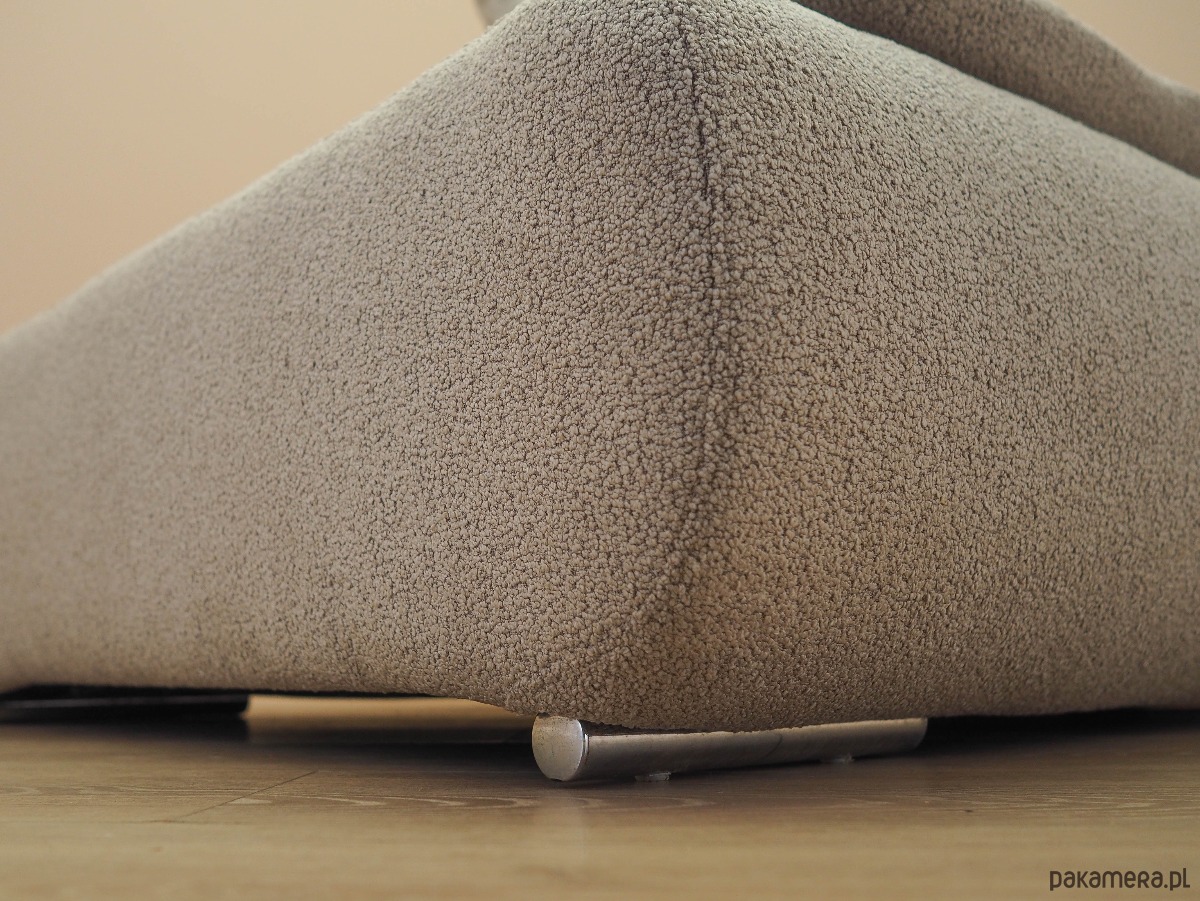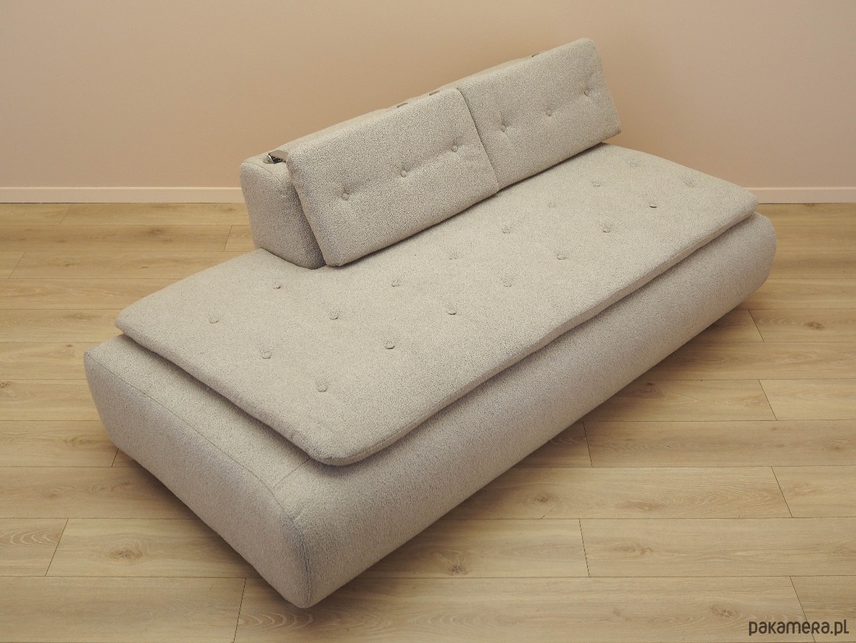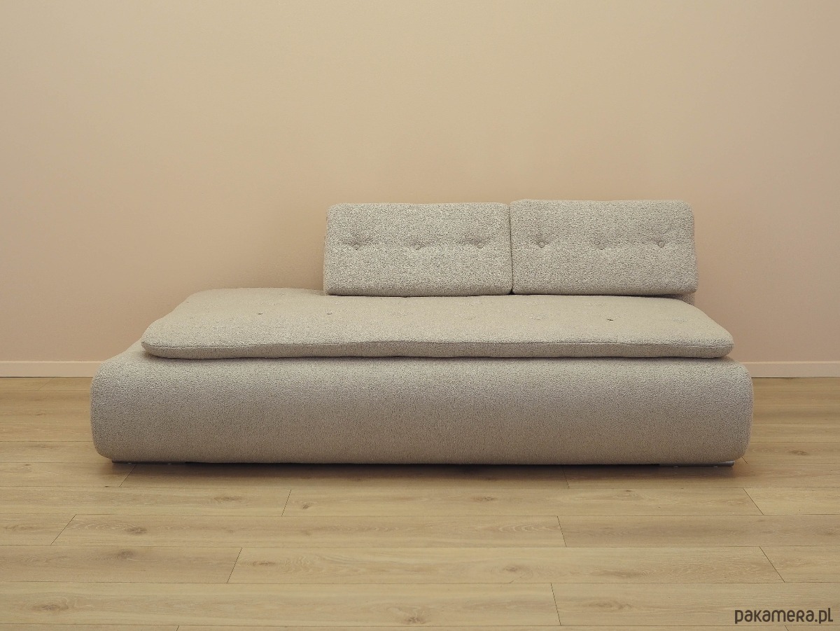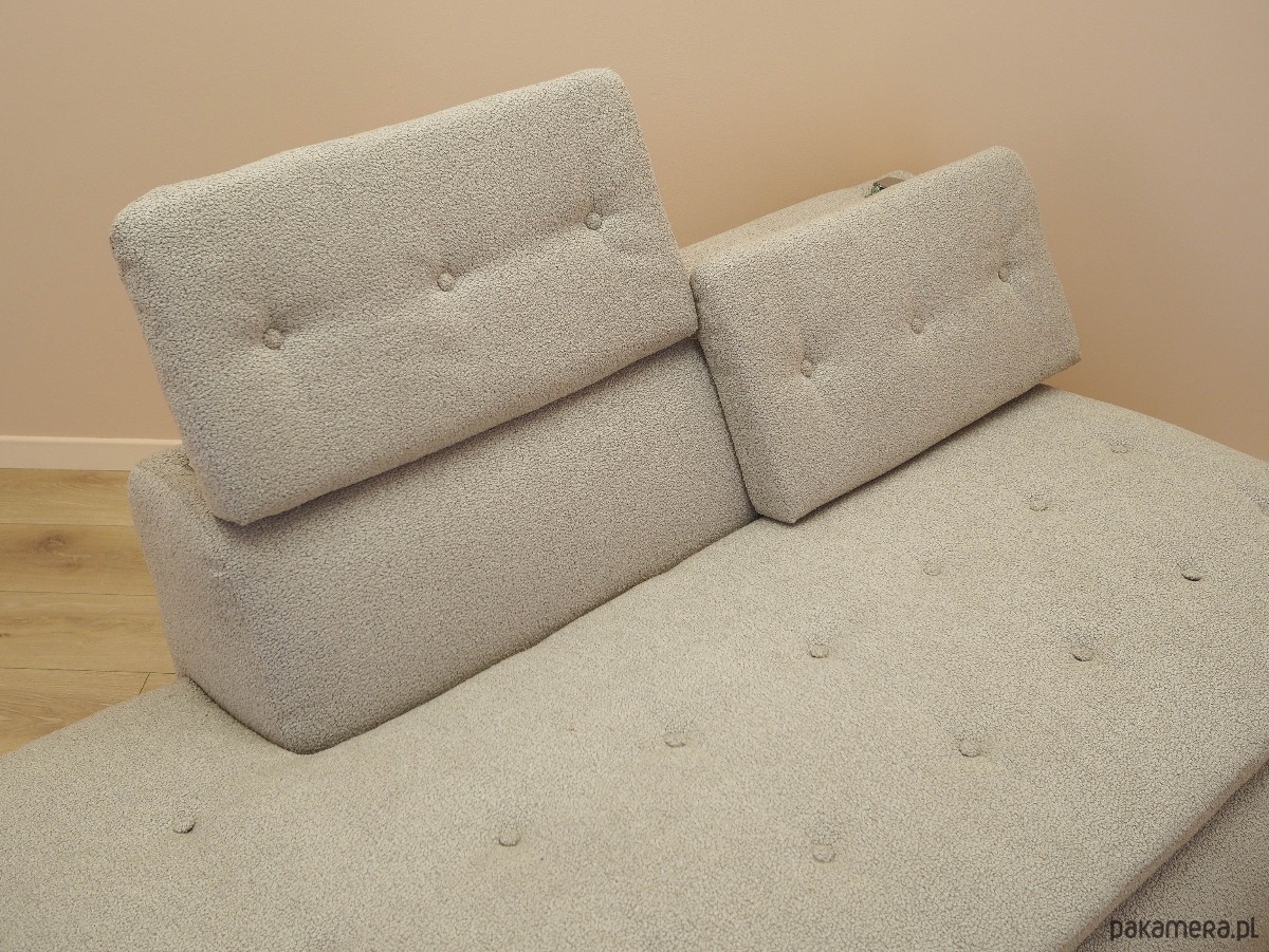 Nogi mebla wykonane z metalu. Sofa została poddana renowacji tapicerskiej, gąbki oraz tkanina wymienione na nowe. Wykorzystana została wysokogatunkowa tkanina w kolorze beżowym. Dodatkowym atutem jest możliwość regulacji wysokości zagłówka.