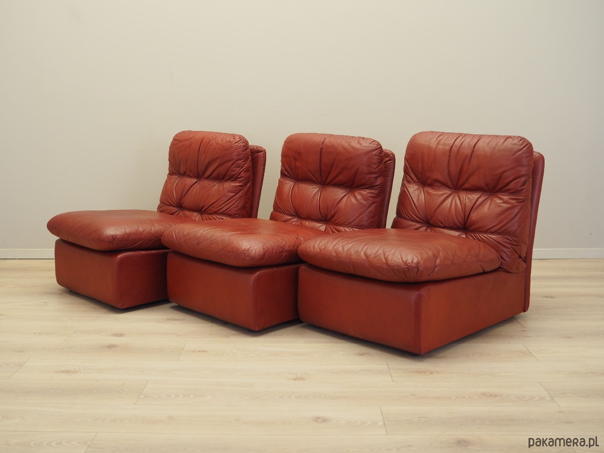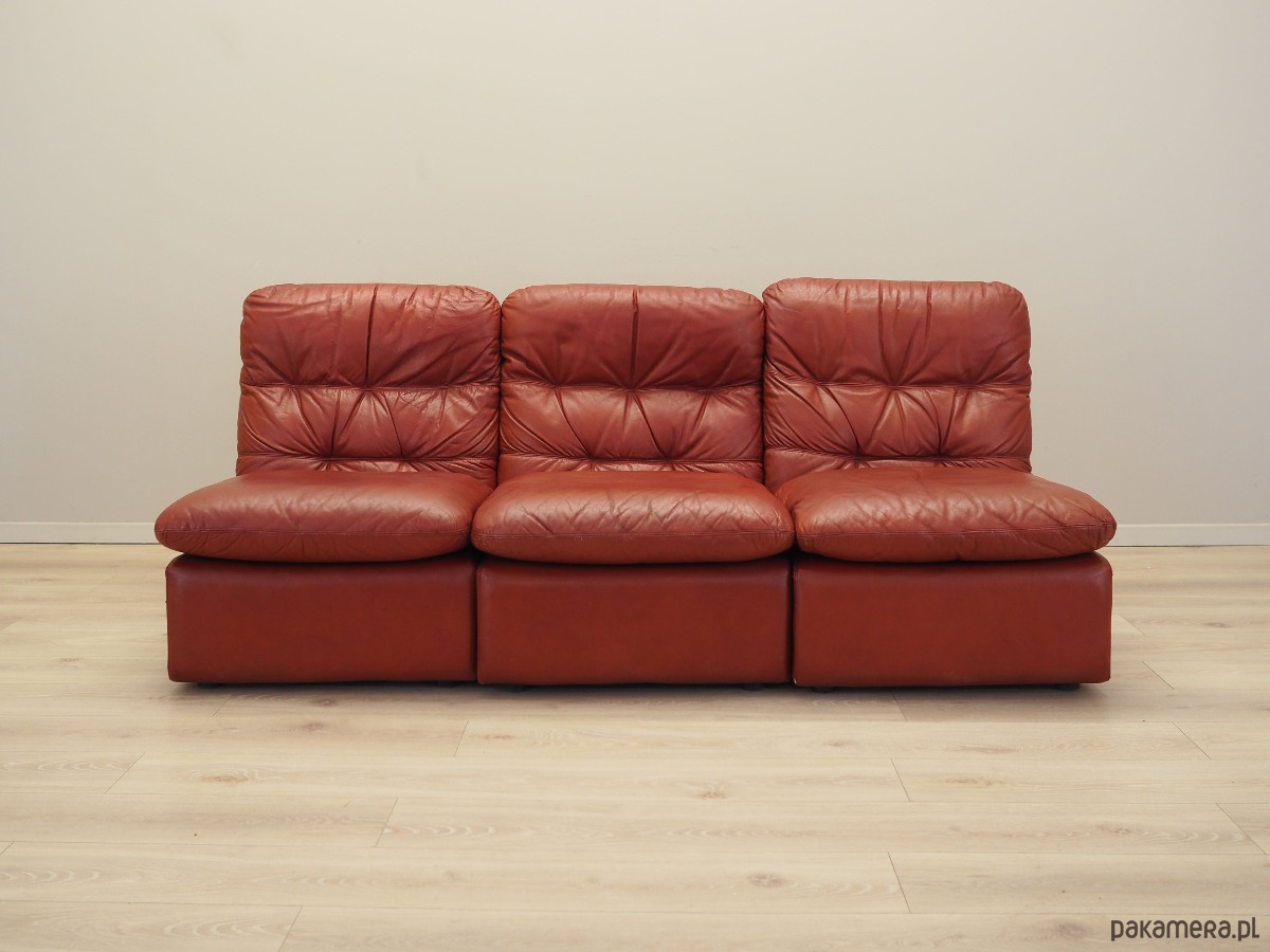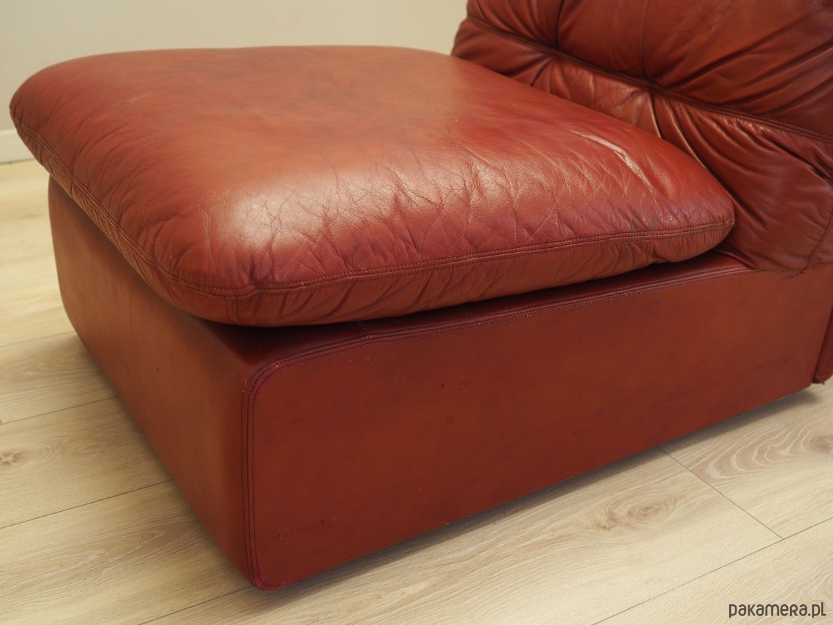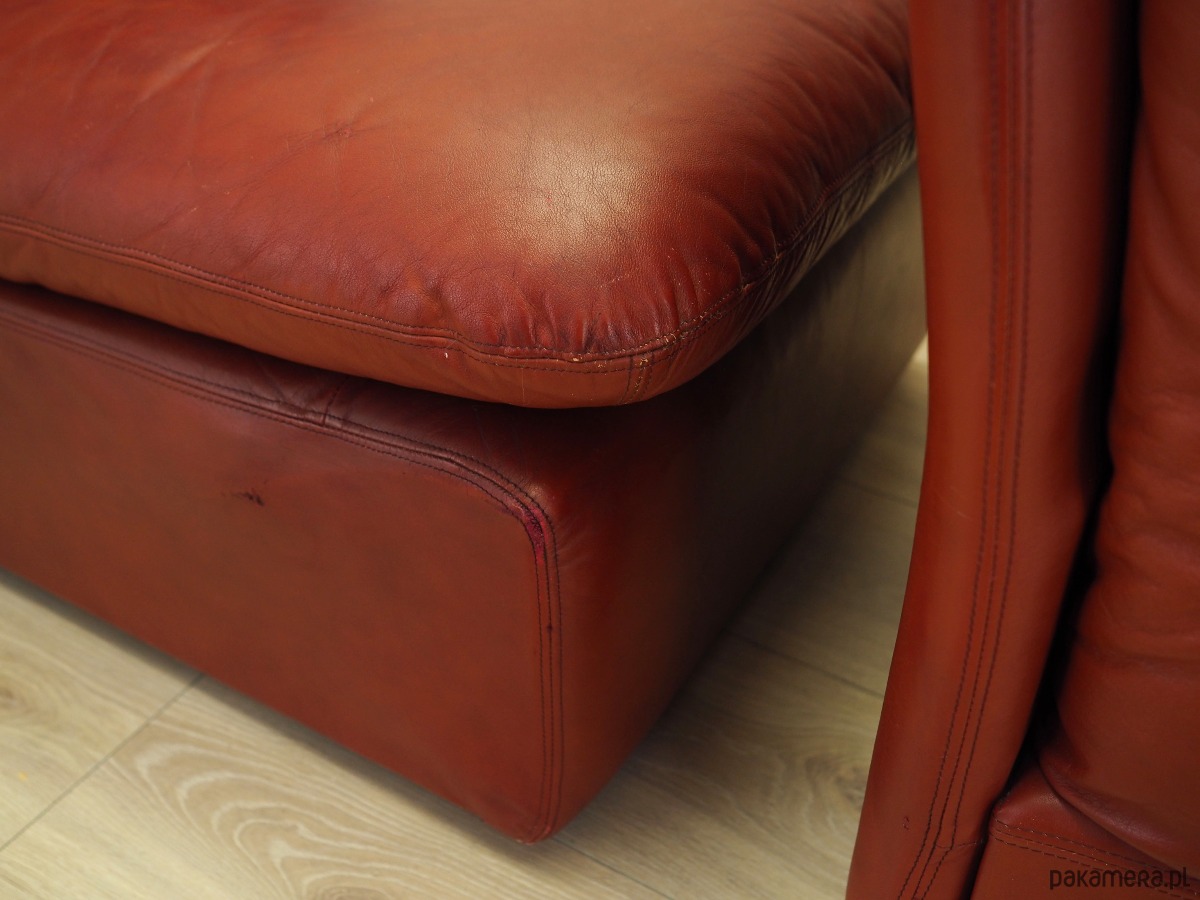 Sofa pokryta jest oryginalną tapicerką. Wykorzystano wysokiej jakości skórę naturalną w kolorze bordowym. Sofa składa się z trzech elementów, które po rozłączeniu mogą służyć jako wygodne fotele.