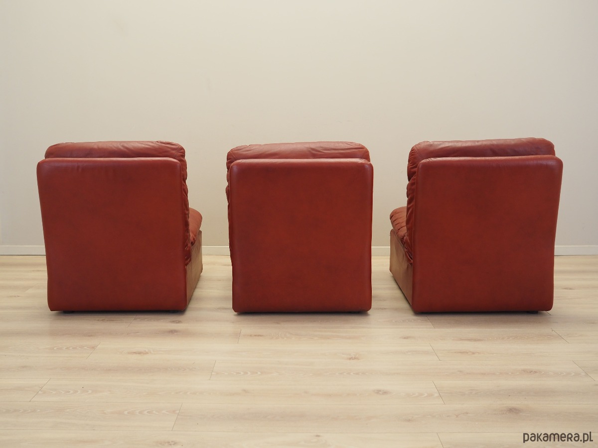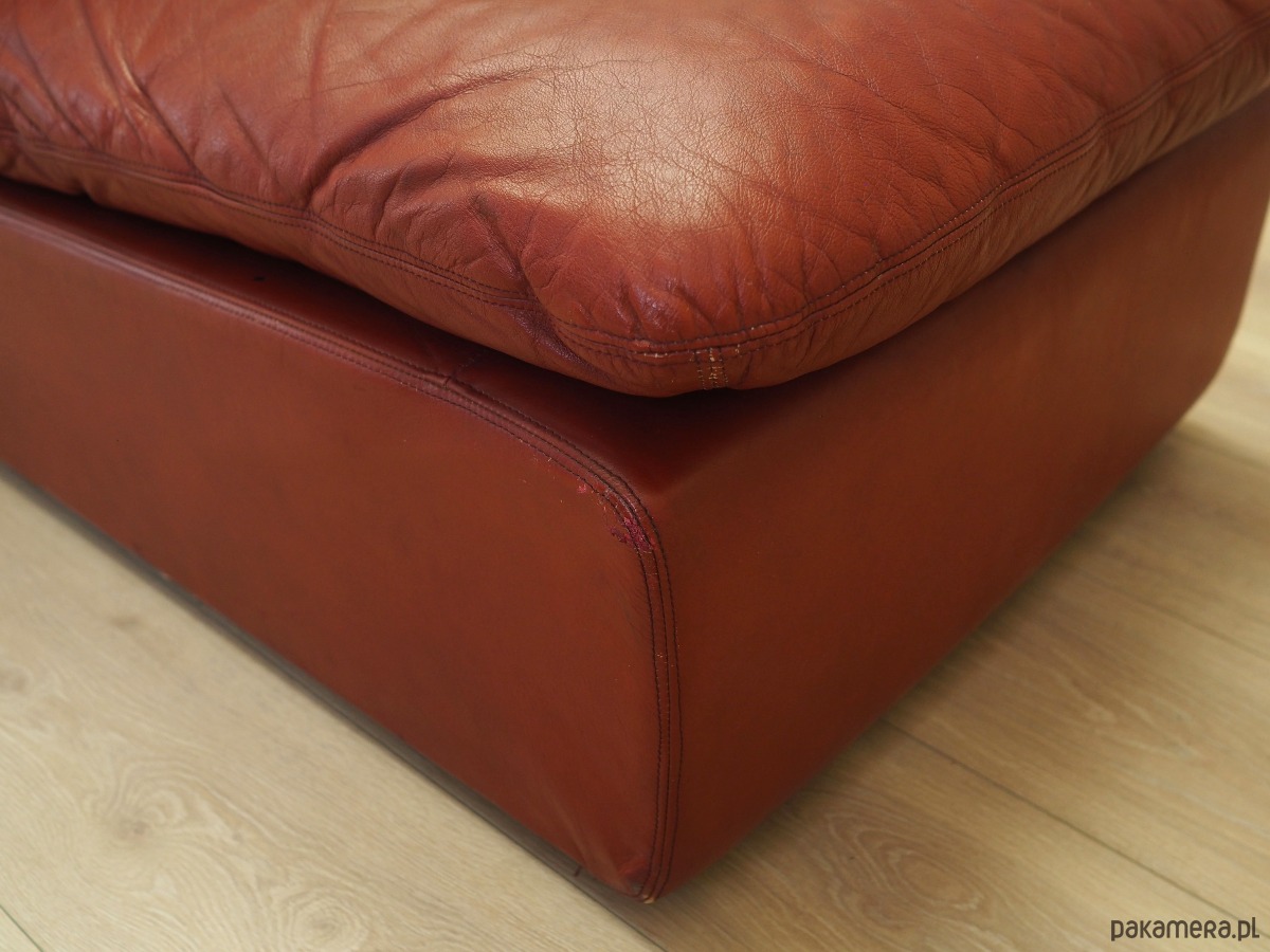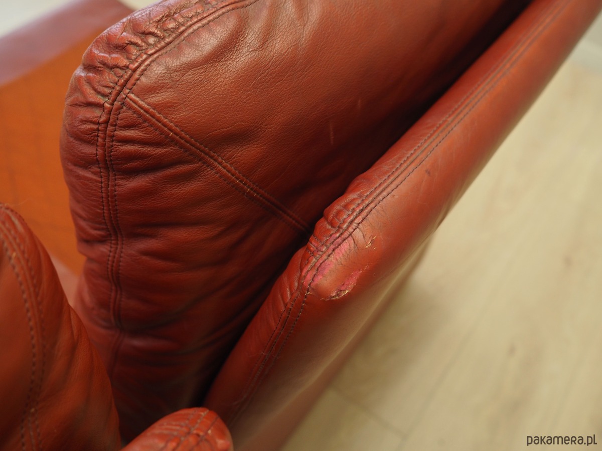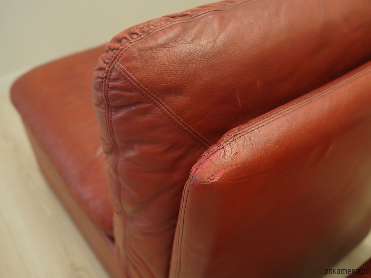 Sofa pokryta jest oryginalną tapicerką. Wykorzystano wysokiej jakości skórę naturalną w kolorze bordowym. Sofa składa się z trzech elementów, które po rozłączeniu mogą służyć jako wygodne fotele.