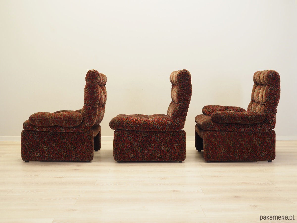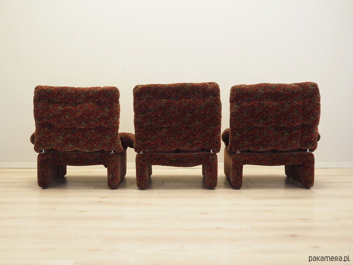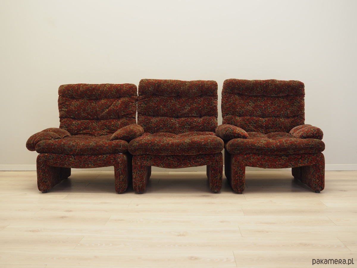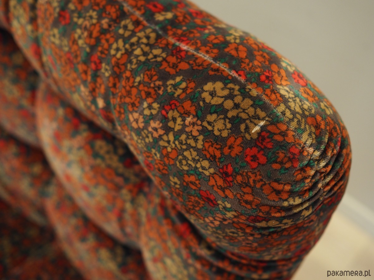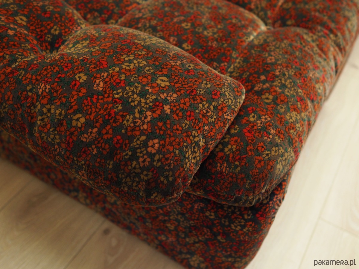 Sofa pokryta jest oryginalną tapicerką. Wykorzystano wysokiej jakości tkaninę welurową w drobny kwiatowy deseń, utrzymany w odcieniach brązu, pomarańczu i beżu. Sofa składa się z trzech elementów, które po rozłączeniu mogą służyć jako wygodne fotele.