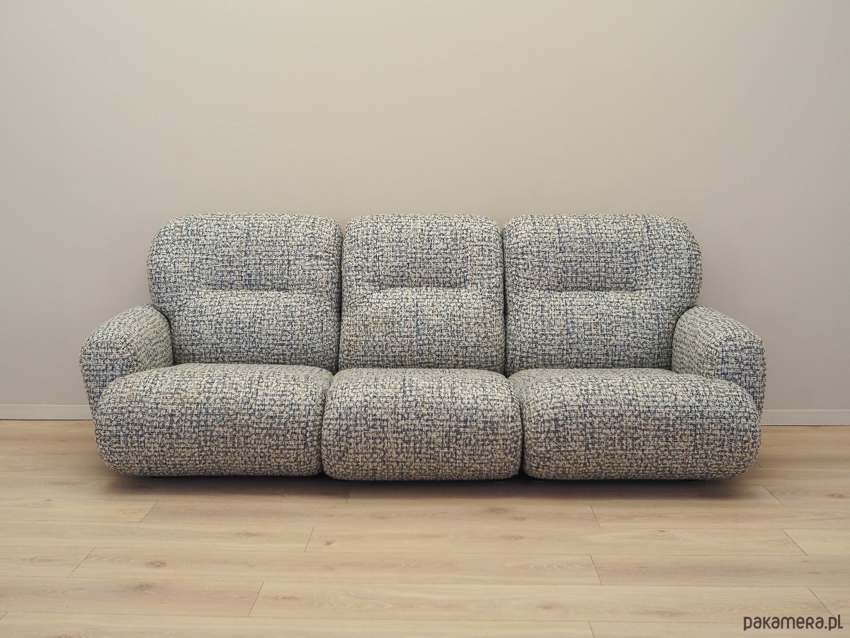 Sofa została poddana renowacji tapicerskiej, gąbki oraz tkanina wymienione na nowe. Wykorzystana została wysokogatunkowa wielokolorowa tkanina. Sofa składa się z trzech elementów, które po rozłączeniu mogą służyć jako wygodne fotele.