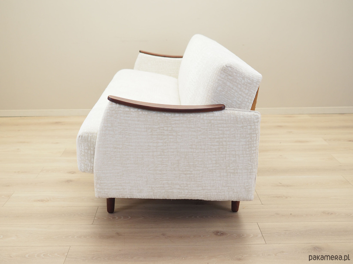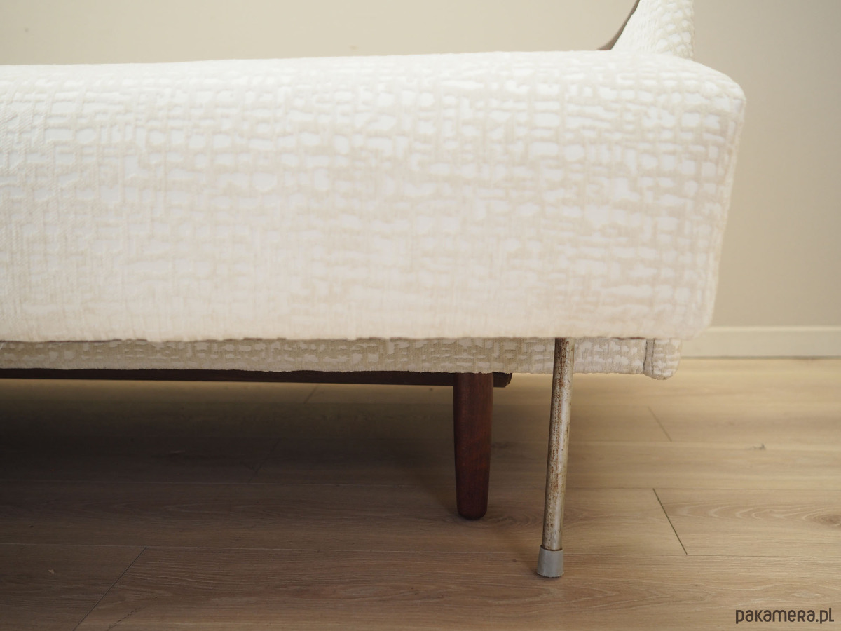 Konstrukcja mebla wykonana z litego drewna. Nogi oraz podłokietniki wykonane z litego drewna tekowego. Sofa została poddana renowacji tapicerskiej, gąbki oraz tkanina wymienione na nowe. Tapicerka wykonana w kolorze ecru, wykorzystana została wysokogatunkowa tkanina. Sofa posiada możliwość rozłożenia i może służyć nam jako wygodne miejsce do spania.