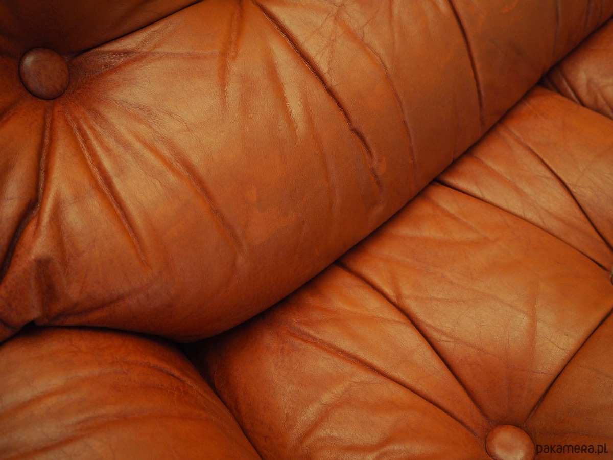 Sofa zachowana w oryginalnej tapicerce. Tapicerka została wykonana w kolorze rudym, wykorzystano wysokogatunkową skórę naturalną. W naszej ofercie dostępne są również rude fotele - razem z sofą stworzą niepowtarzalny zestaw.