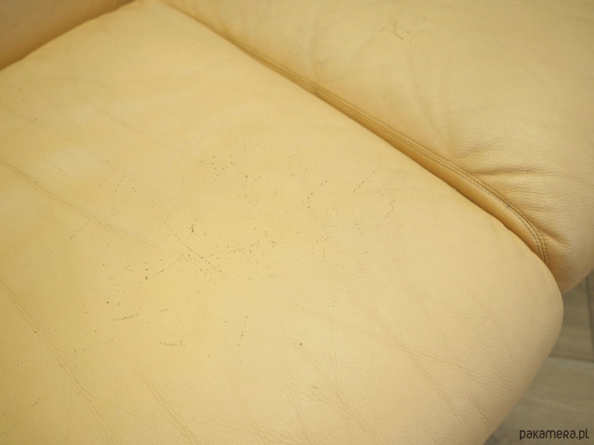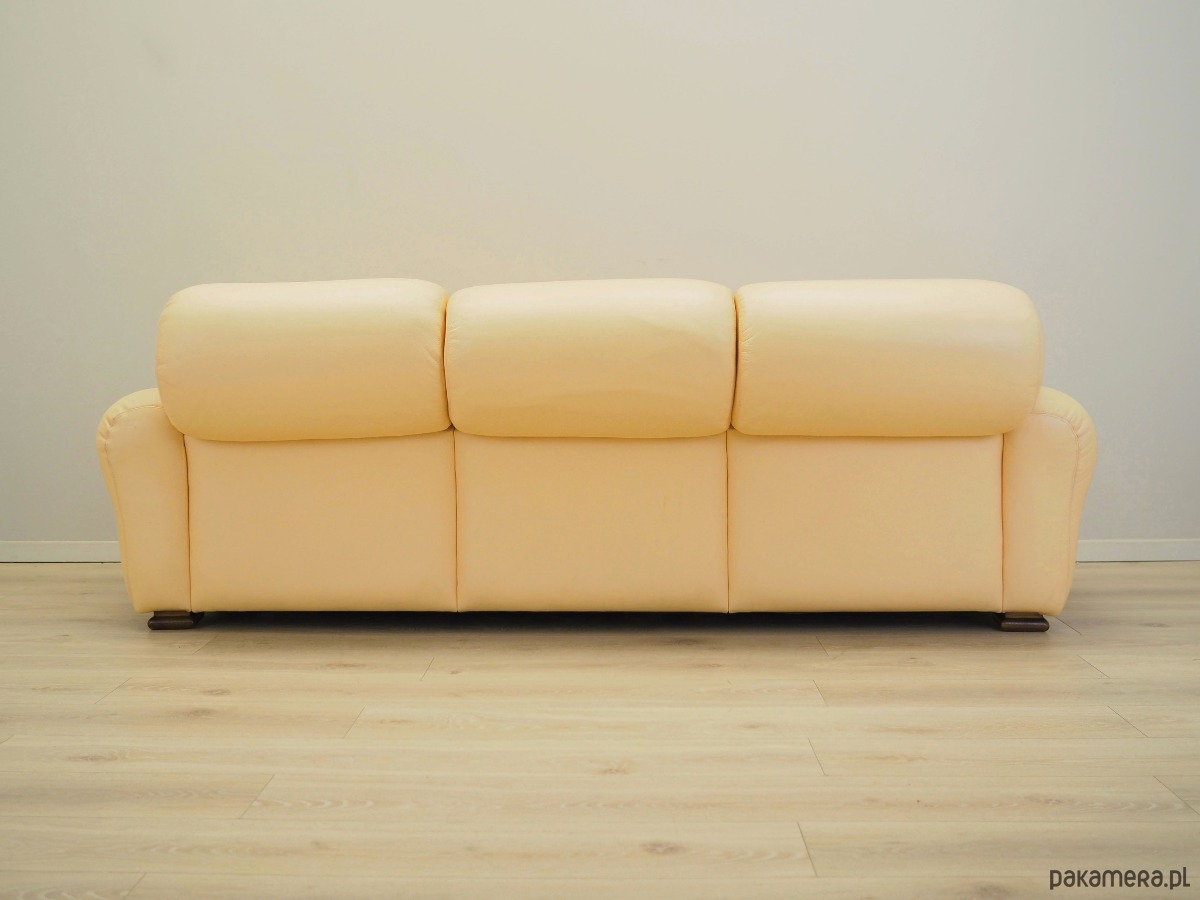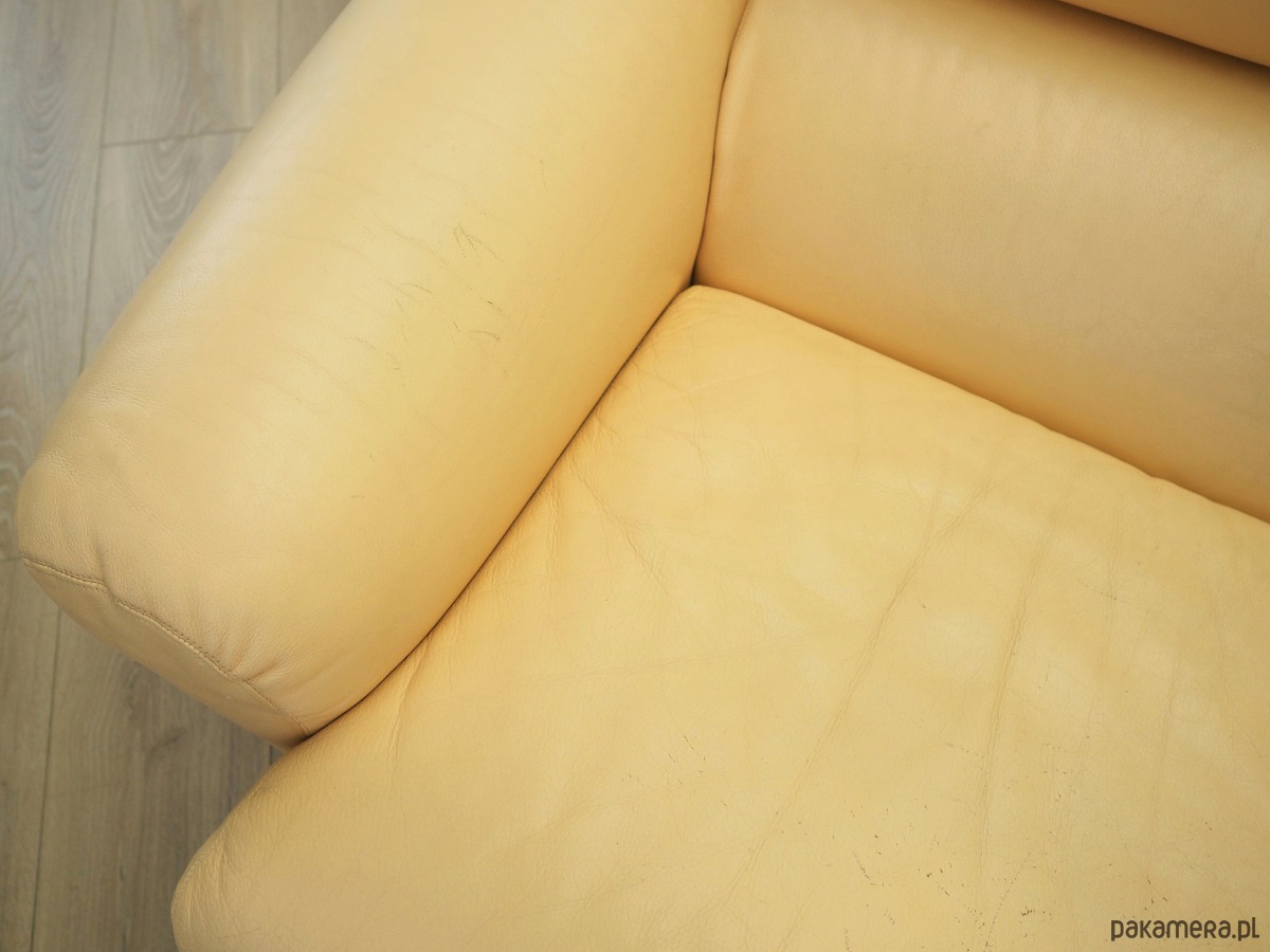 Konstrukcja została wykonana z litego drewna. Sofa zachowana jest w oryginalnej, wysokiej jakości skórze naturalnej w kolorze morelowym.