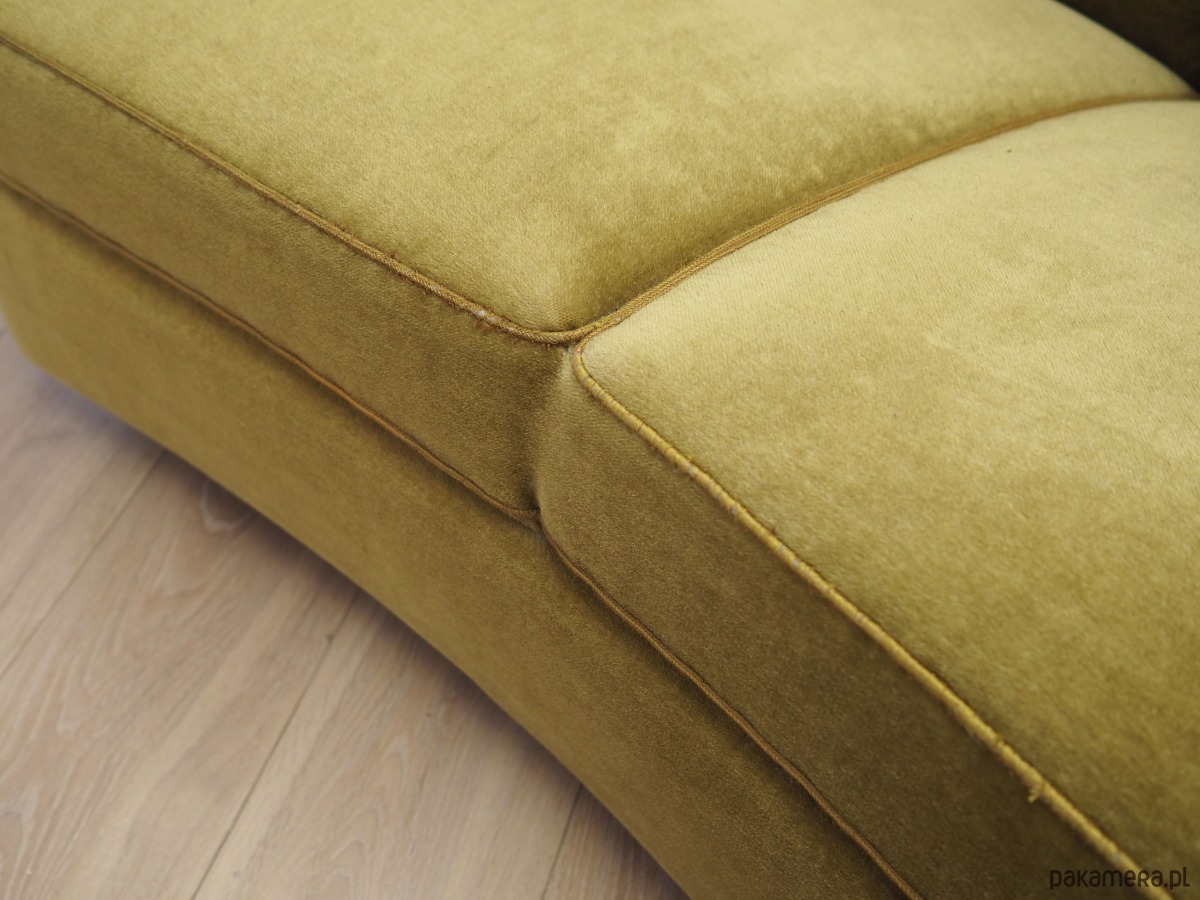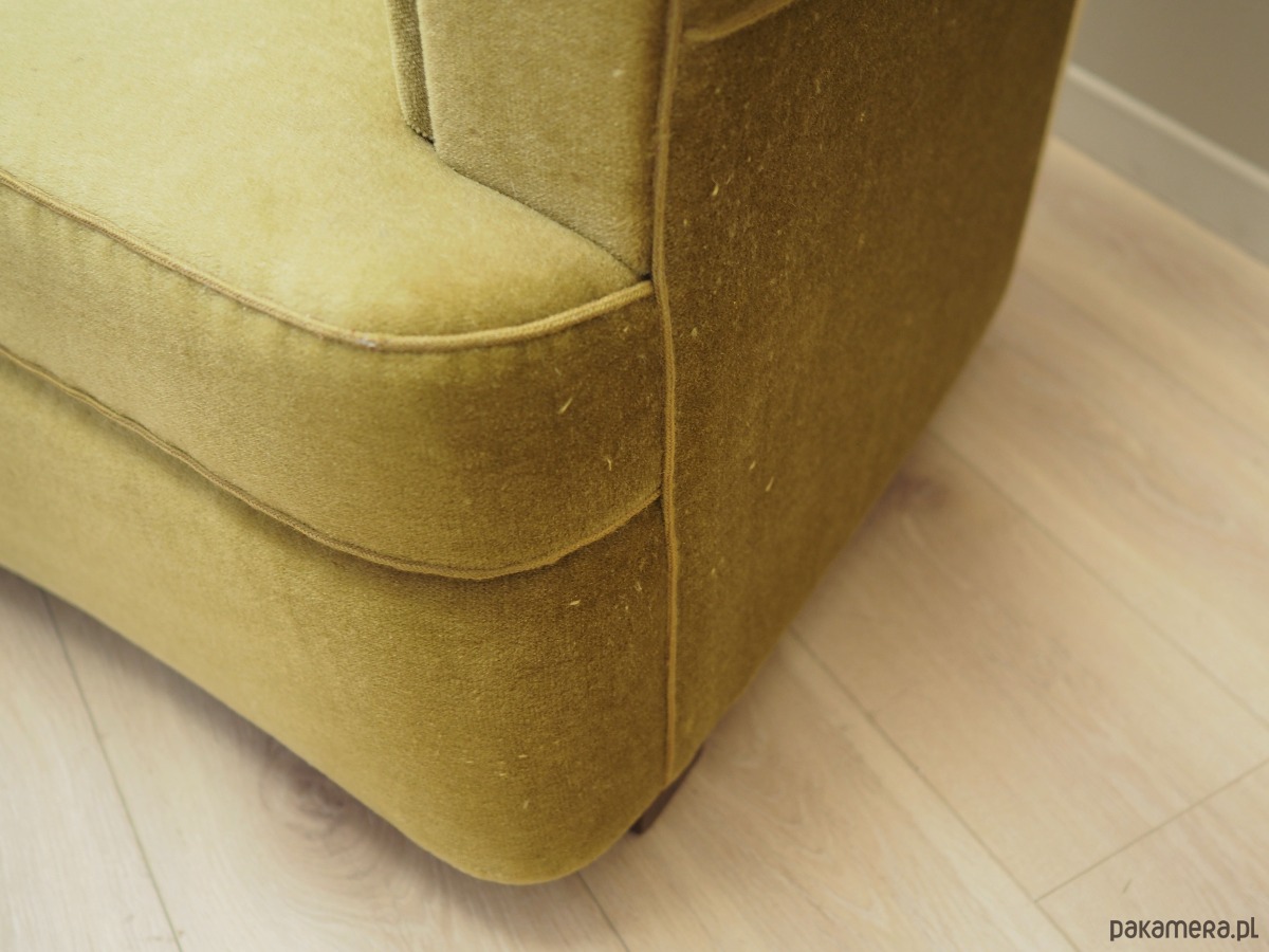 Konstrukcja mebla wykonana z litego drewna. Nogi wykonane z litego drewna bukowego. Drewno po odświeżeniu. Sofa zachowana w oryginalnej tapicerce. Tapicerka wykonana w kolorze zielonym, wykorzystana została wysokogatunkowa tkanina welurowa.