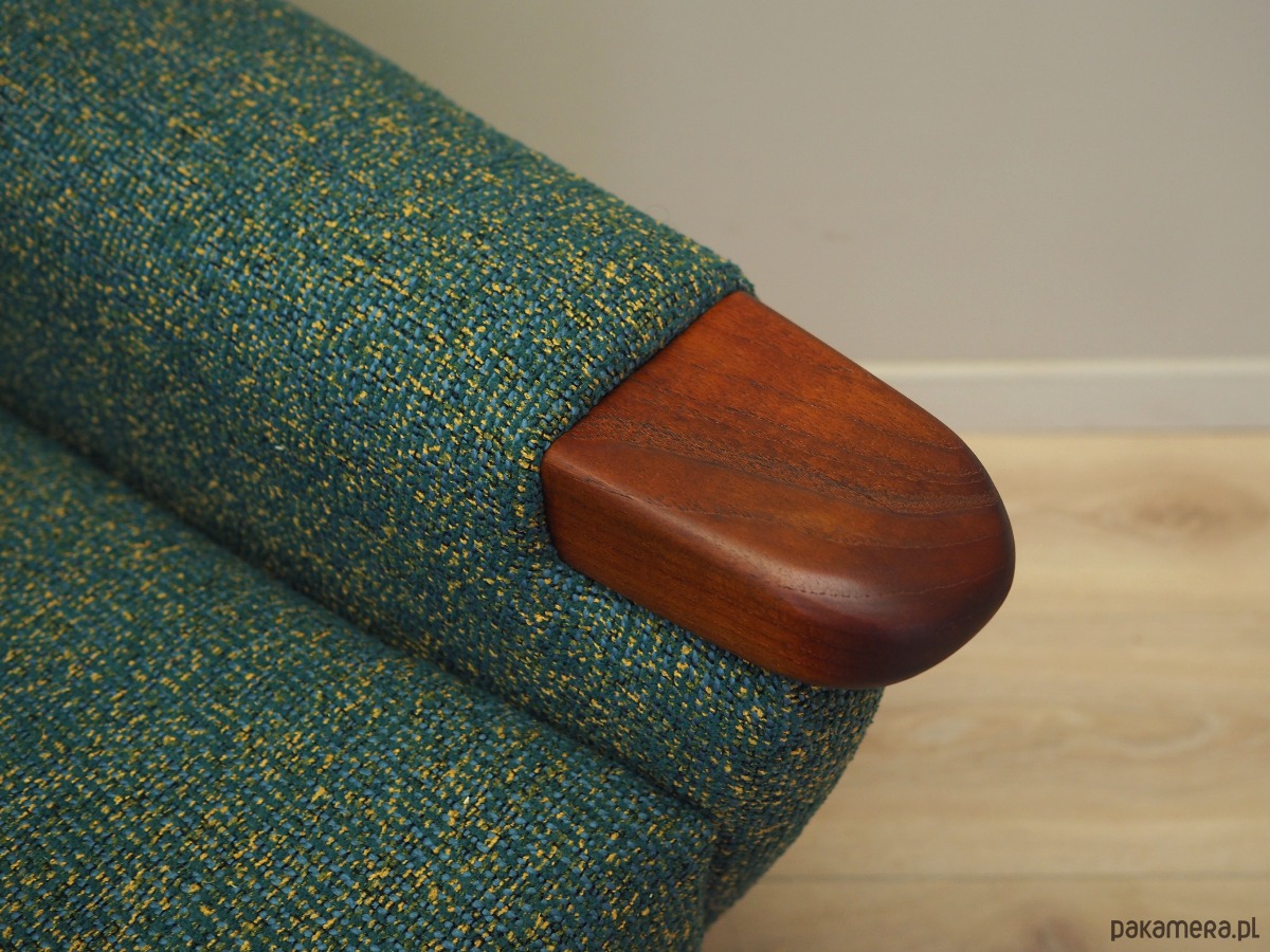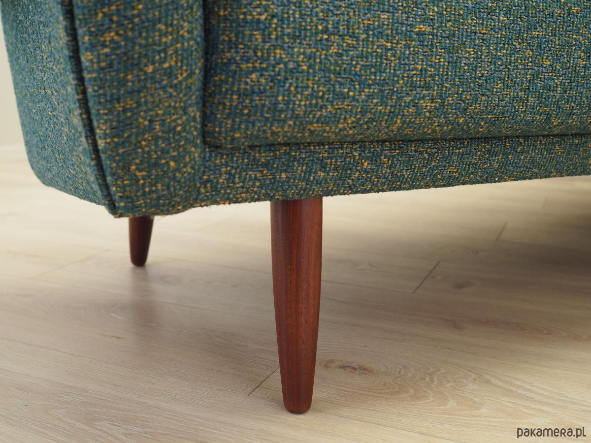 Konstrukcja mebla wykonana z litego drewna. Nogi wykonane z litego drewna tekowego. Sofa została poddana renowacji tapicerskiej, gąbki oraz tkanina wymienione na nowe. Tapicerka została wykonana w kolorze zielonym, wykorzystana została wysokogatunkowa tkanina melanżowa.