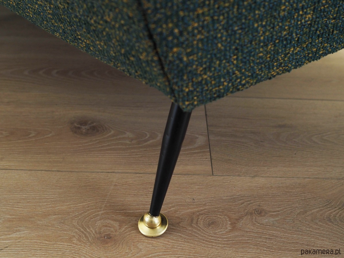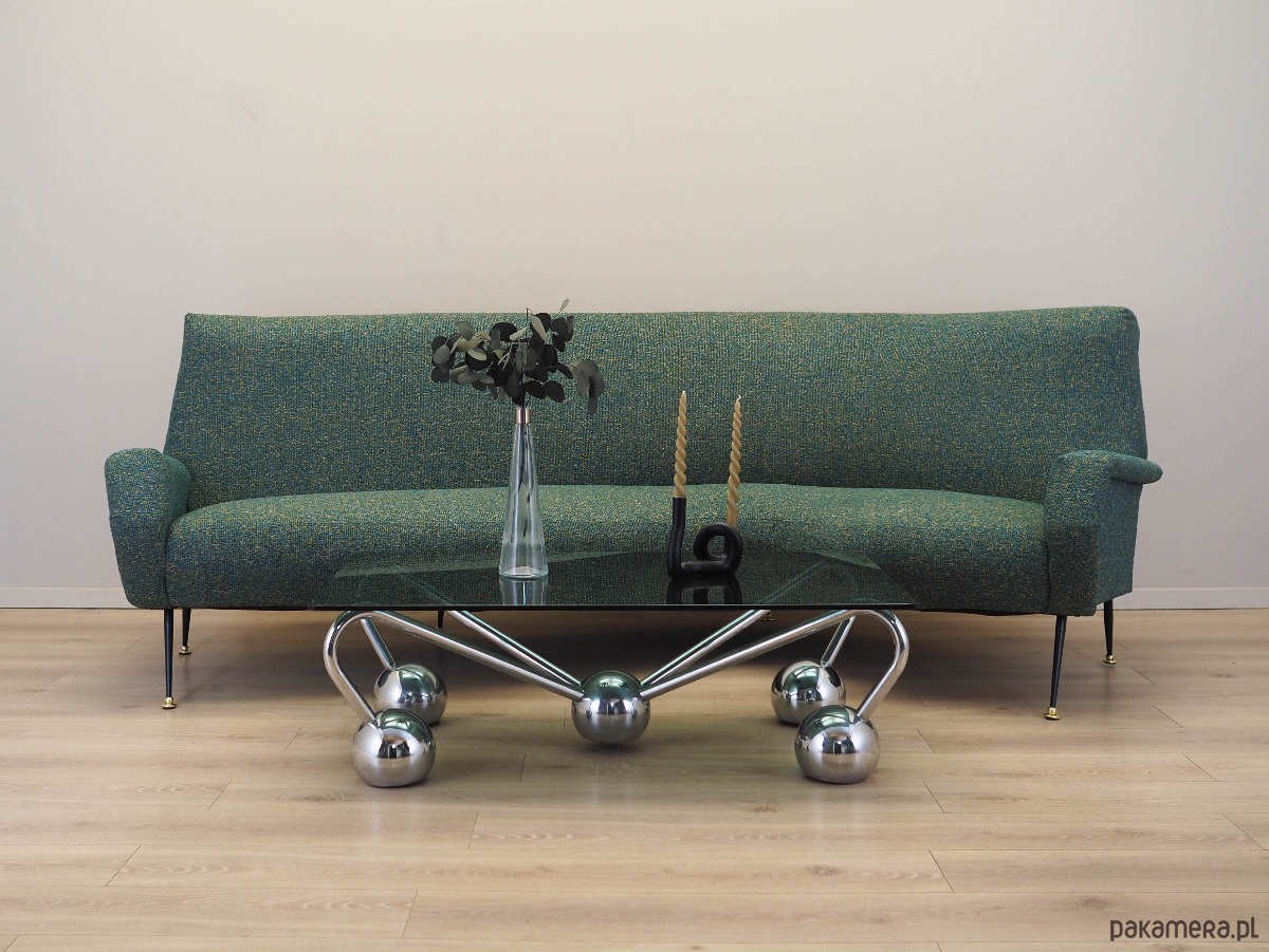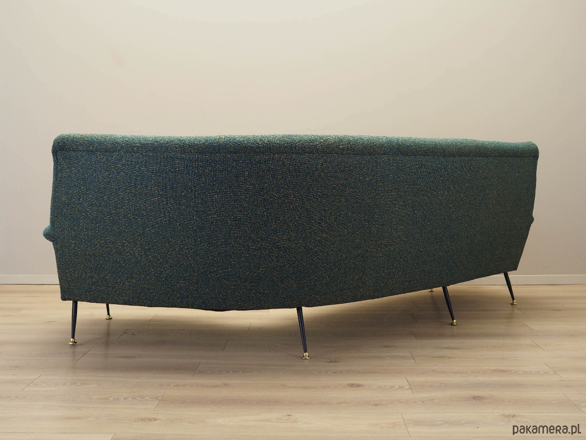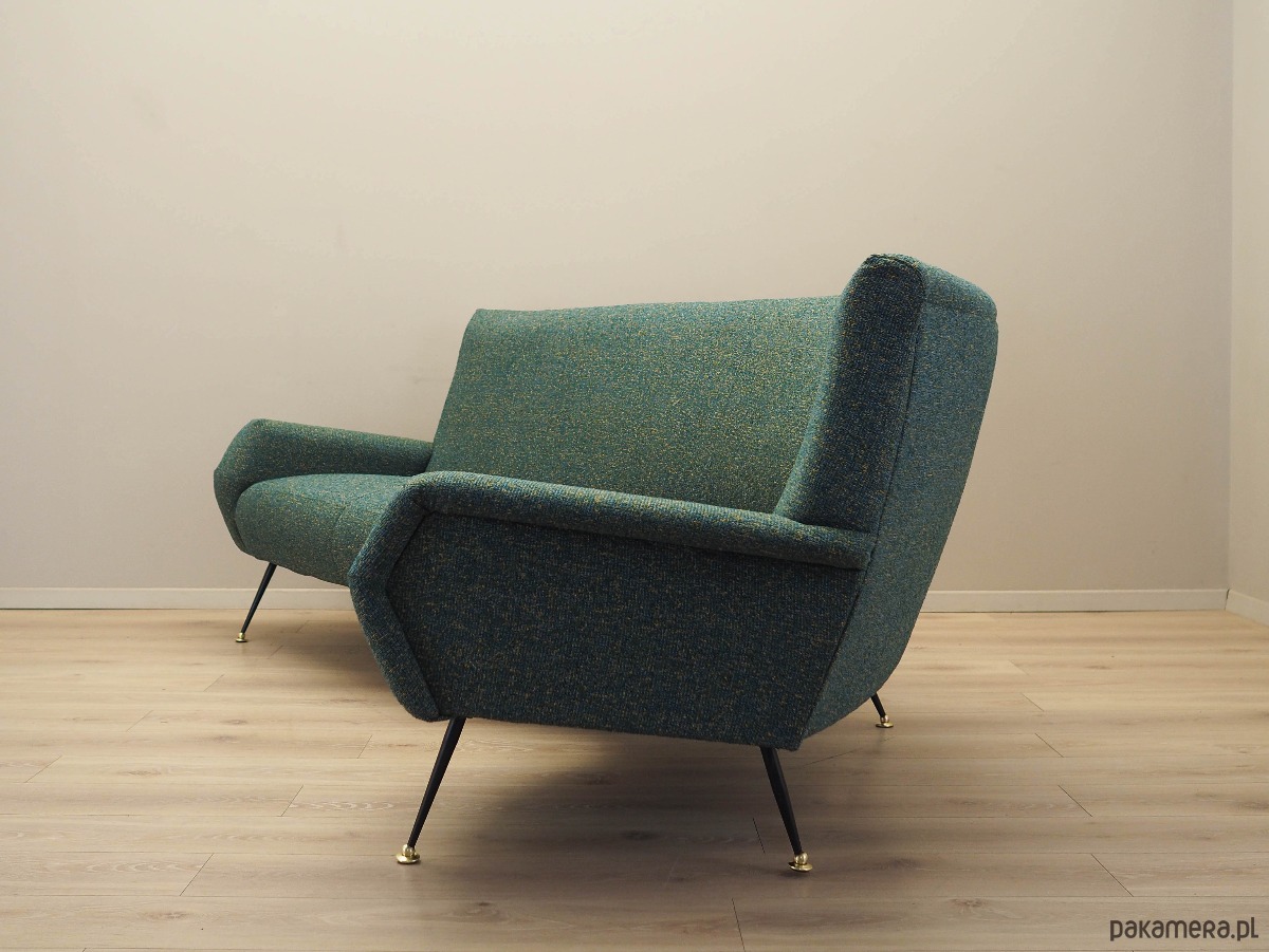 Nogi mebla wykonane z metalu. Sofa została poddana renowacji tapicerskiej, gąbki oraz tkanina wymienione na nowe. Tapicerka wykonana w kolorze zielonym, wykorzystana została wysokogatunkowa tkanina melanżowa.
