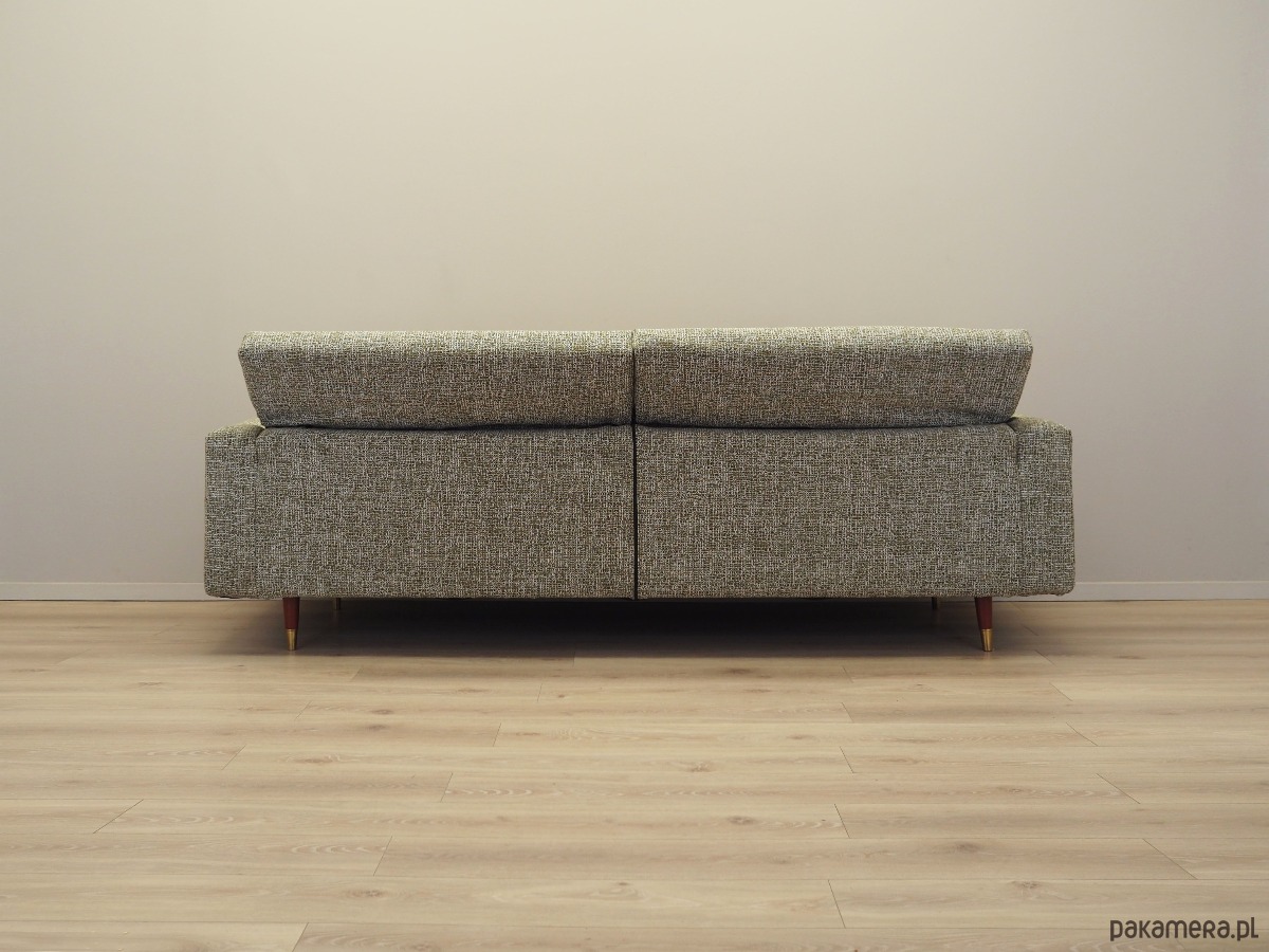 Konstrukcja i nogi mebla wykonane z litego drewna. Drewno po odświeżeniu. Sofa została poddana renowacji tapicerskiej, gąbki oraz tkanina wymienione na nowe. Tapicerka została wykonana w kolorze zielonym, wykorzystana została wysokogatunkowa tkanina melanżowa.