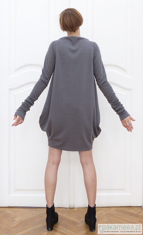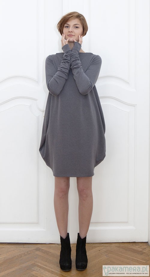 Sukiena uszyta z grubszej, eleganckiej, bardzo dobrej jakości dzianiny, nie mechacącej się (70% wiskoza, 22% nylon, 8% elastan) poszerzana do wysokości bioder i zwężona ku dołowi na szerokość kroku, dekolt podniesiony, łódkowy, rękawy wąskie, marszczone na przedramieniu, również z rękawem do łokcia, długość ok. 95 cm, kolory i rozmiary do uzgodnienia, zapraszam