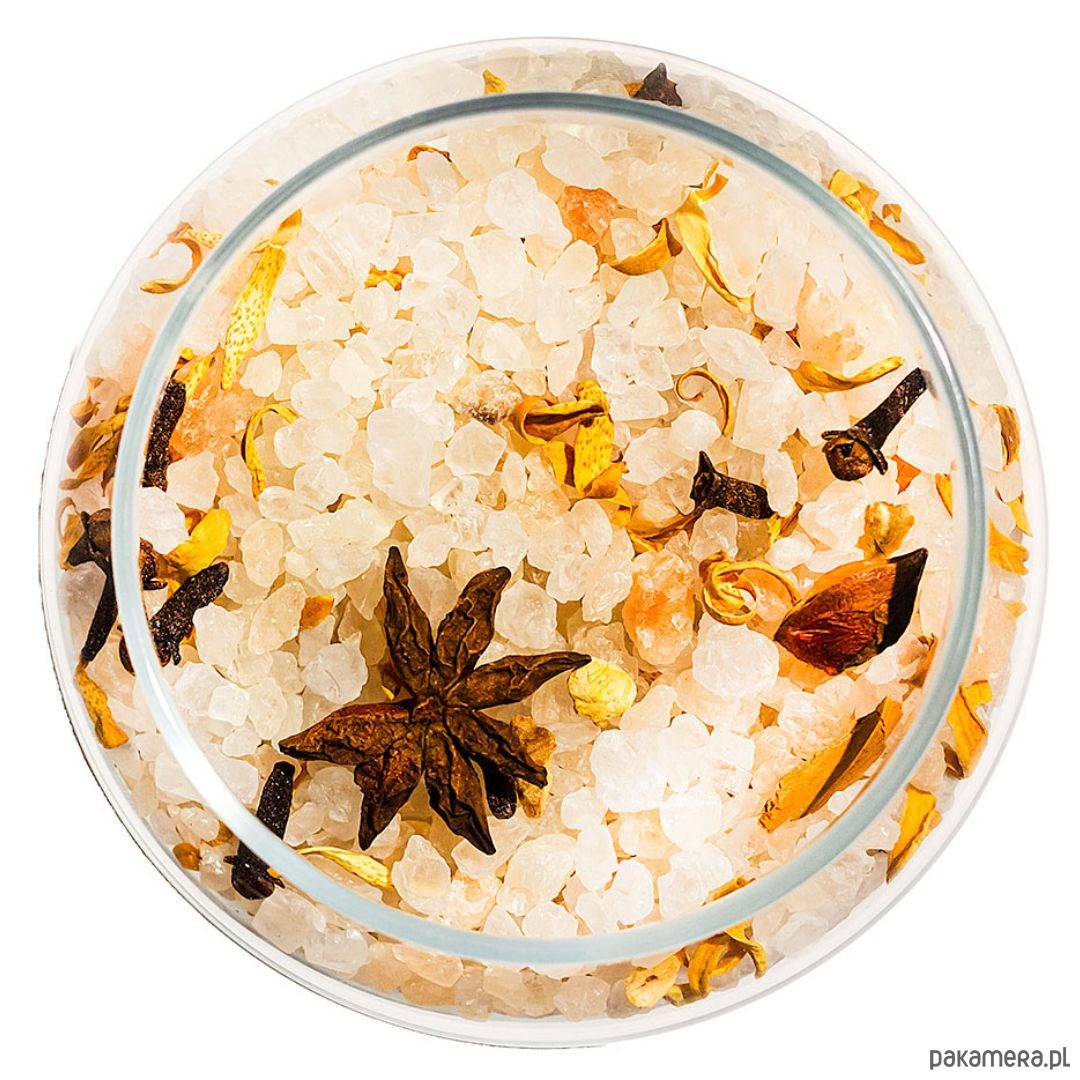 sól kłodawska, suszone kwiaty pomarańczy, goździki, olejek eteryczny słodka pomarańcza, kompozycja zapachowa wanilia, olejek eteryczny cynamon