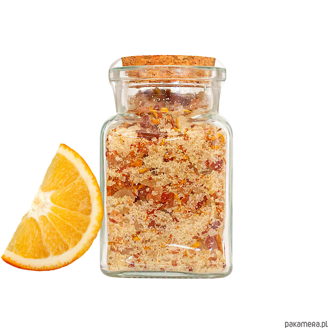 różowa sól himalajska, sól z morza martwego, płatki pomarańczy, olejek eteryczny słodkiej pomarańczy.