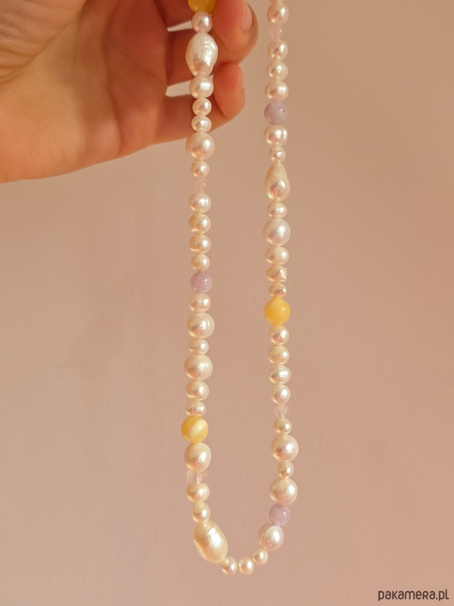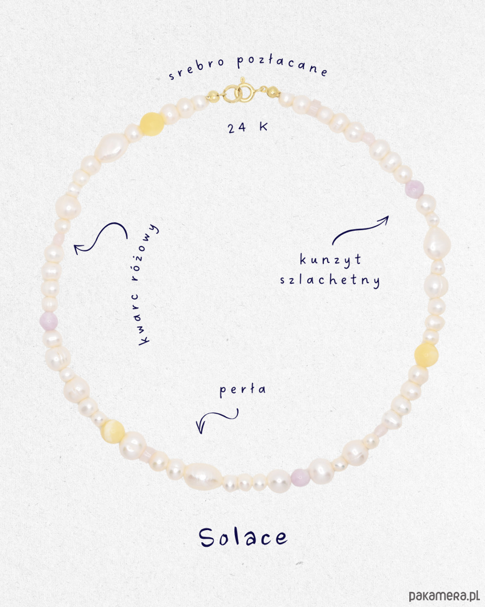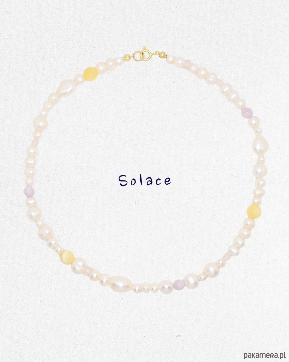 SOLACE to delikatny, jasny naszyjnik oparty głównie na naturalnych perłach, których miękki połysk nadaje całości harmonijny charakter. Kompozycję uzupełniają subtelne akcenty kunzytu, kwarcu różowego oraz żółtego kamienia, wprowadzając pastelowe nuty i lekkie przełamanie klasycznej perłowej formy.
