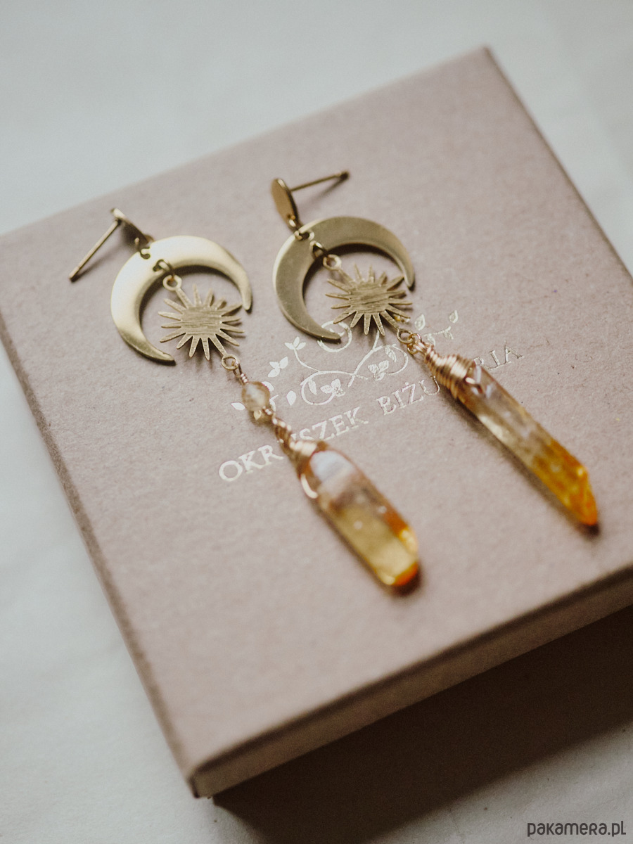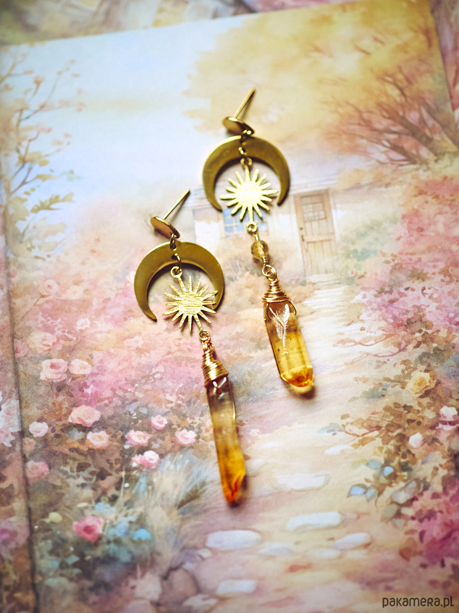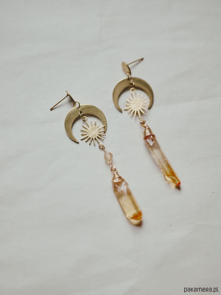 Ten model to klasyk wśród biżuterii dla wiedźm i czarodziejek! Przepełnione są mocą dzięki symbolice księżyca i gwiazd. Wykańcza je naturalny kryształ kwarcu barwiony na złocisty, słoneczny kolor. Delikatnie asymetryczne, z dodatkiem kuleczki cytrynu.