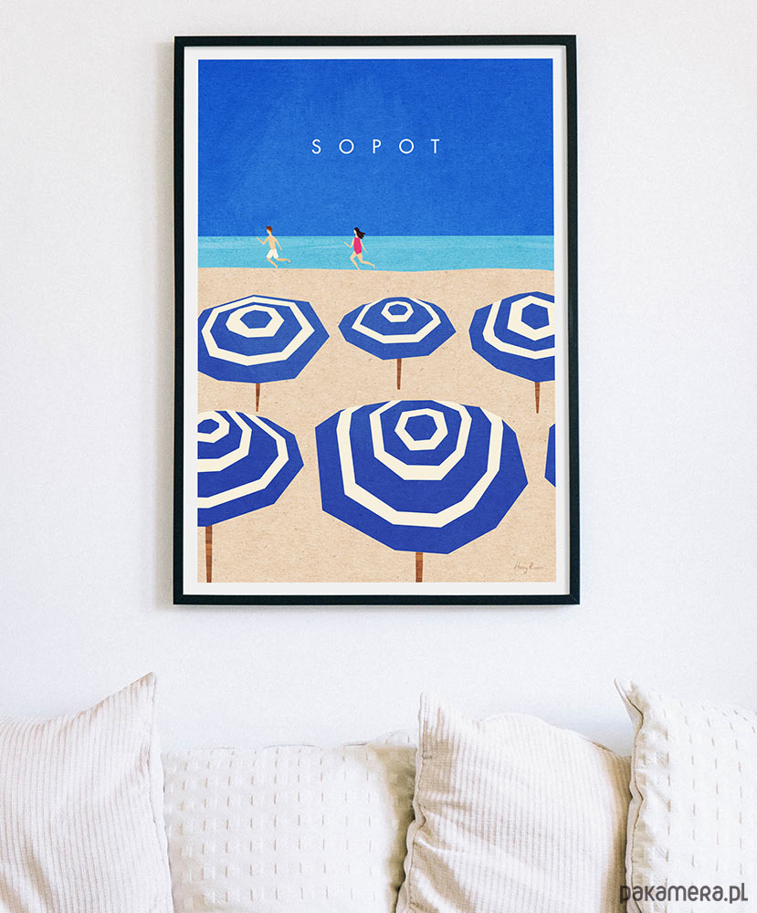 Najbardziej stylowe miejsce na polskim wybrzeżu, gdzie elegancja spotyka się z letnim relaksem. Oczywiście mowa o pięknym Sopocie. Plakat "Sopot - plaża z parasolkami" bawi się stylistyką retro łącząc współczesny design z nutą nostalgii. Grafika pełna jest radosnego, wakacyjnego nastroju.