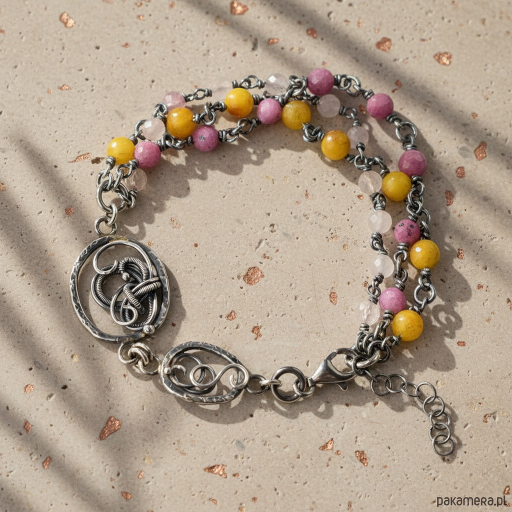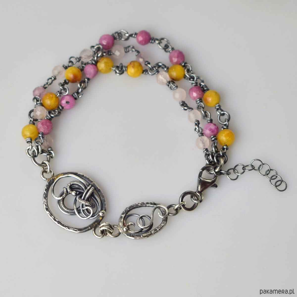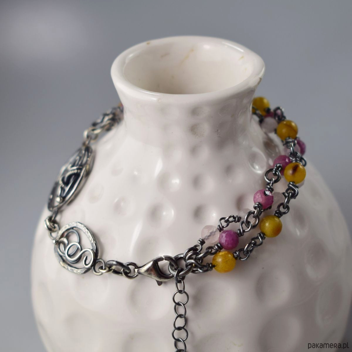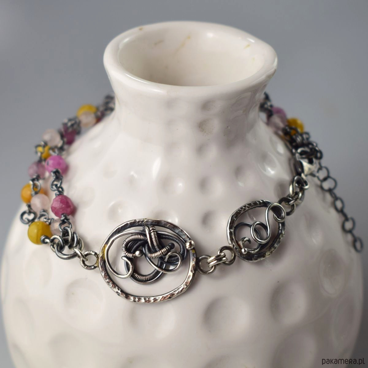 Bransoletka wykonana ze srebra próby 925, zaprojektowana jako kompozycja dwóch owalnych form, które płynnie przechodzą w sznur kamieni (rubin, kwarc różowy i bursztyn).
