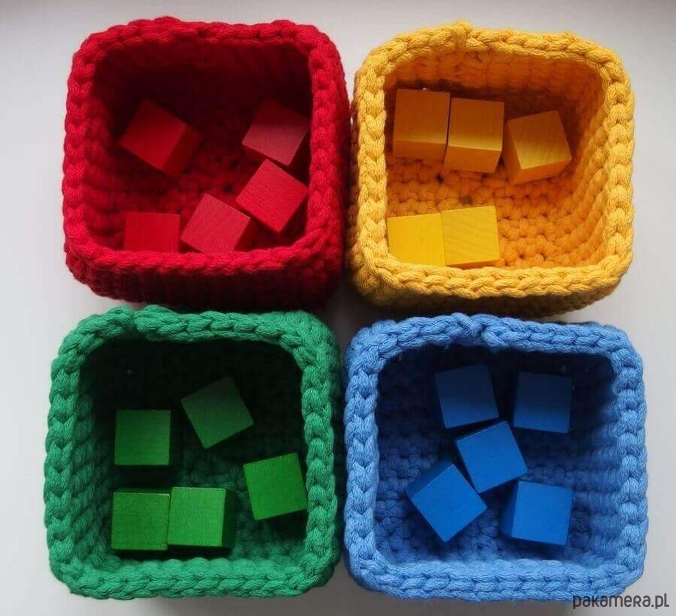 Zestaw to 4 kolory koszyków w kwadracie. Łatwiej je wtedy umieścić na półce, czy tacy. Wielkość koszyka to ok. 13 na 13 cm, a wysokość 8 cm.