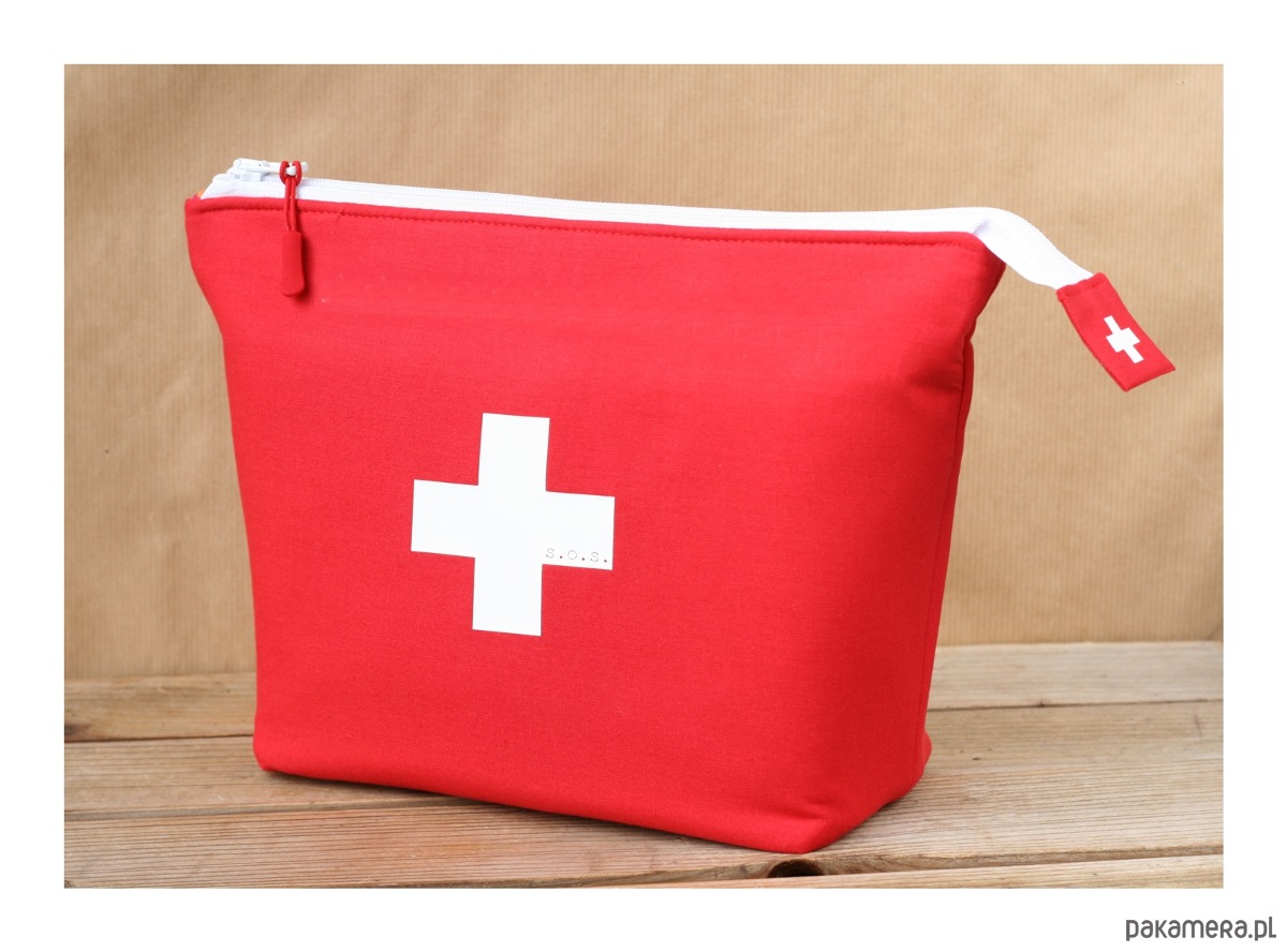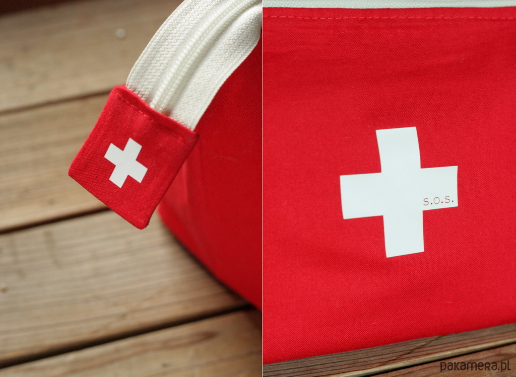 Apteczka posiada aplikację z termofolii z krzyżykiem z napisem S.O.S. Aplikacja znajduje się również na tkaninowej końcówce suwaka (bez napisu).