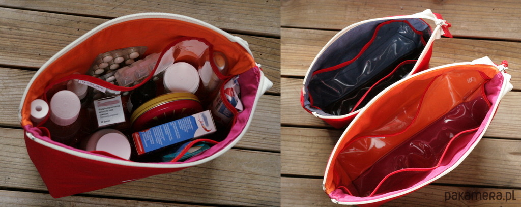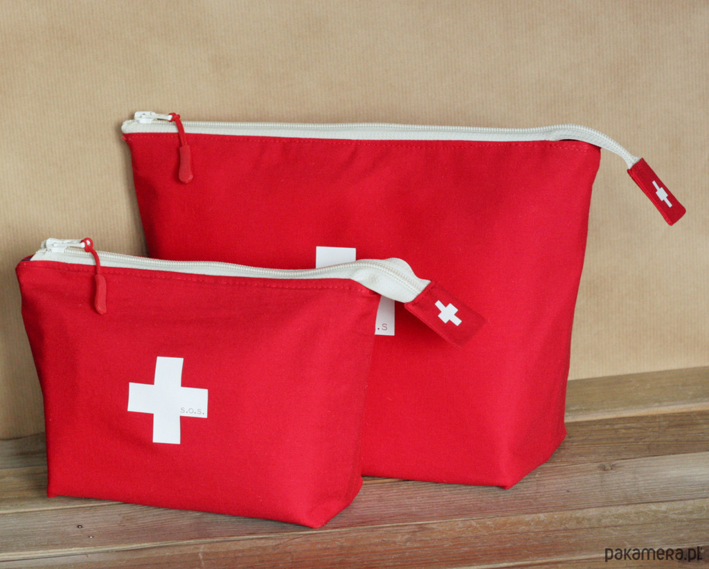 Kosmetyczko-apteczka, która pomieści niezbędne leki w podróży. Kosmetyczka uszyta z bawełny, cienkiej ociepliny i miękkiej folii. Posiada kieszonki z przeźroczystej folii, do których można wsunąć mniejsze leki, termometr, bandaż. Na środku zaś można poustawiać buteleczki i pudełka z lekami. Idealna na krótszy wyjazd lub na mniejsze potrzeby. W ofercie również posiadamy małą apteczkę.