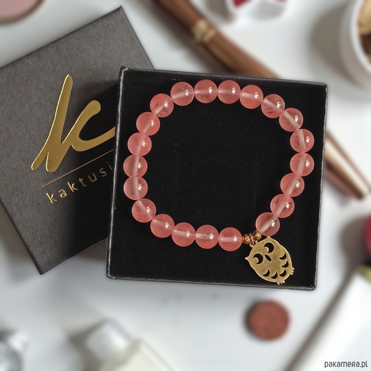 Bransoletka na solidnej gumce jubilerskiej wykonana z kwarcu (8mm) oraz złotego hematytu i zawieszki - sowy - z pozłacanej stali szlachetnej (nie uczula)