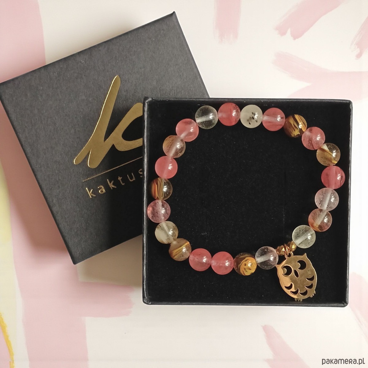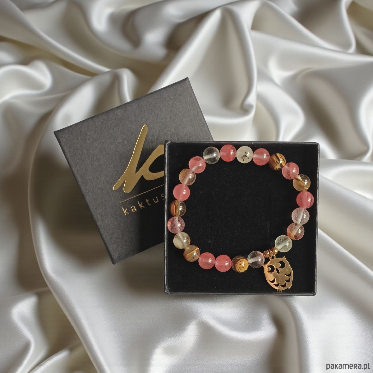 Bransoletka na solidnej gumce jubilerskiej wykonana z kwarcu (8mm) oraz złotego hematytu i zawieszki - sowy - z pozłacanej stali szlachetnej (nie uczula)