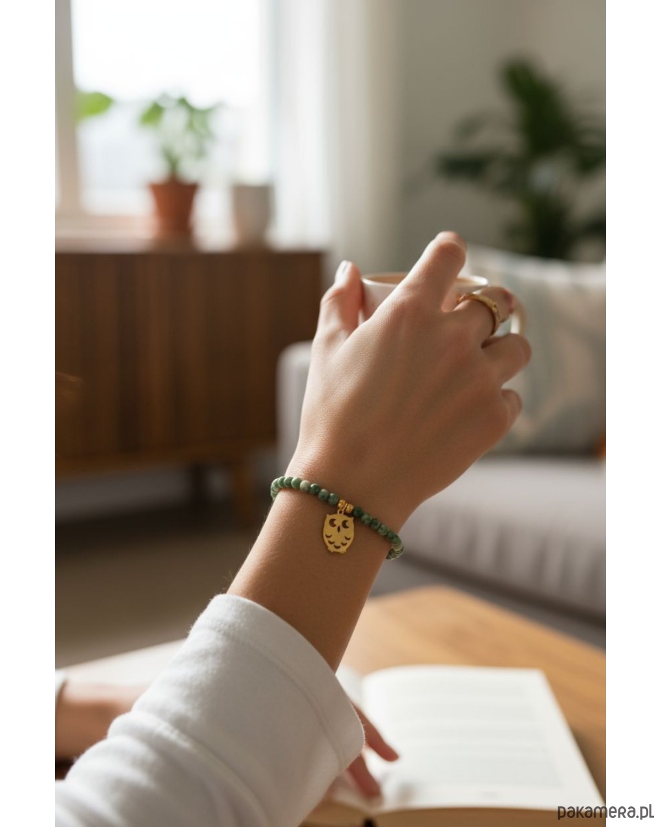Bransoletka na solidnej gumce jubilerskiej wykonana z jaspisu (4mm) oraz złotego hematytu i zawieszki - sowy - z pozłacanej stali szlachetnej (nie uczula)