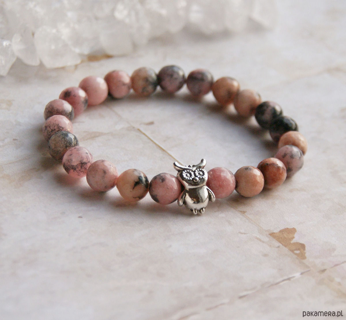TUTAJ: urocza, delikatna bransoletka na solidnej lince elastycznej, wykonana z kul fasetowanego, wielobarwnego jadeitu rodonitowego (8mm) , do tego urocza przekładka - SOWA.