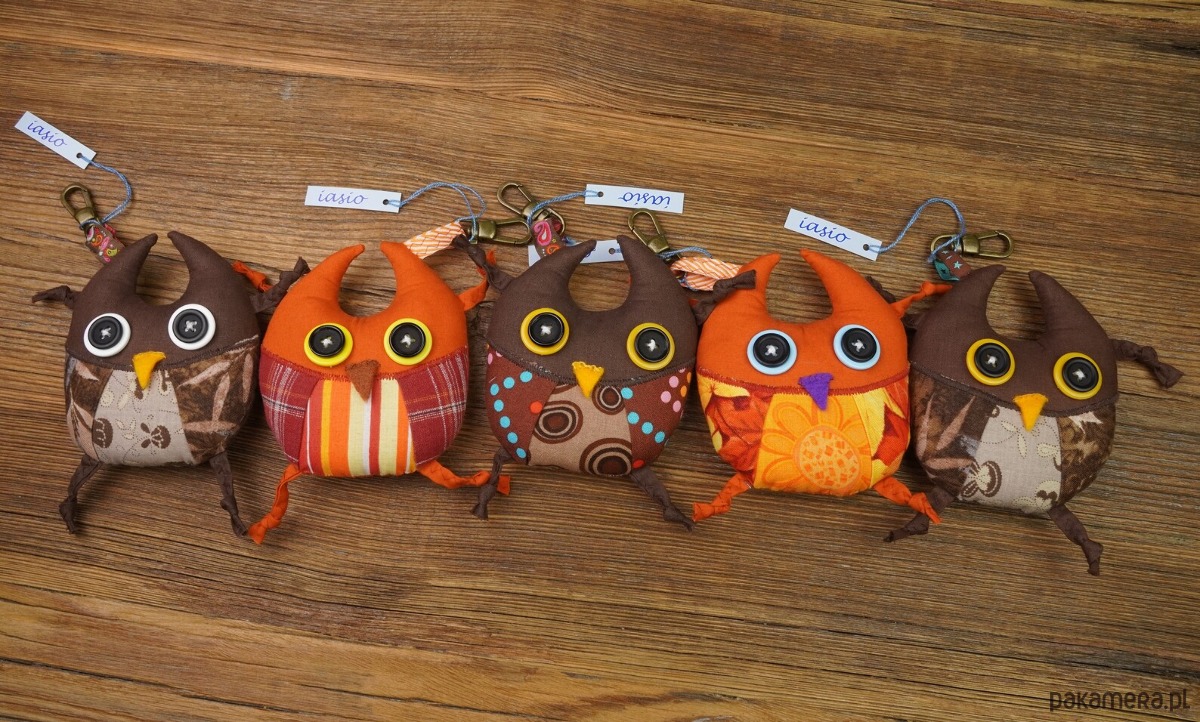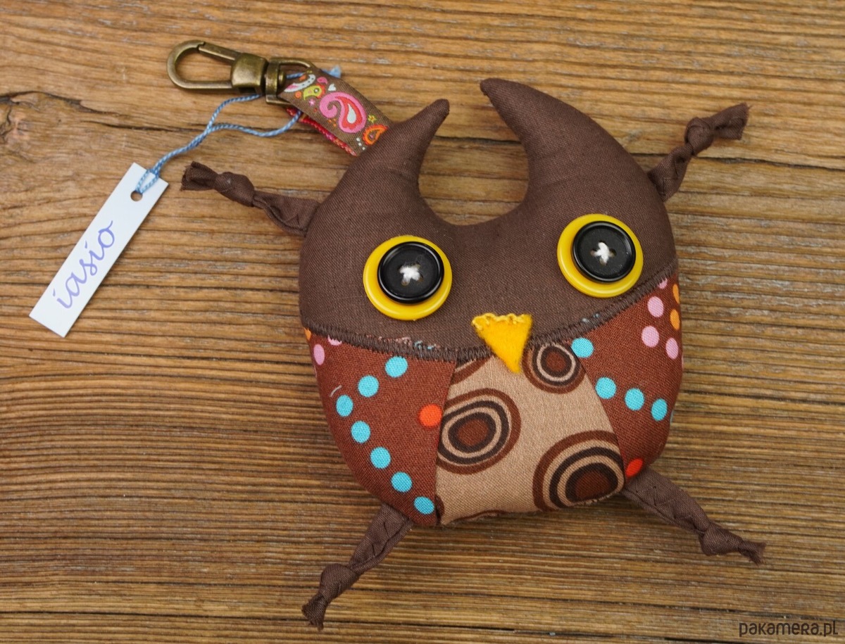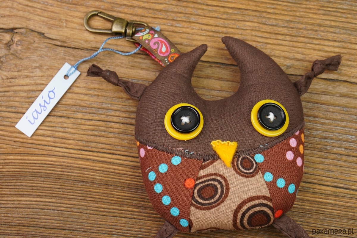 Sówka - brelok. Uszyty z bawełny, wypchany ocieplinką. Wymiary: 12cm x 14cm (nie licząc zawieszki). Drobny prezent na urodziny, pod choinkę lub na Walentynki :) lub bez okazji ;).