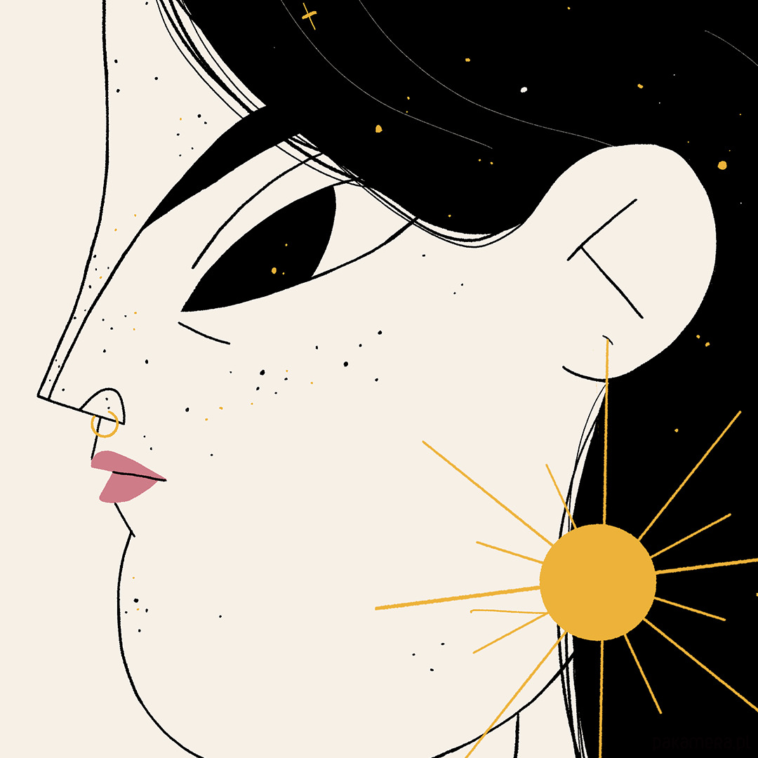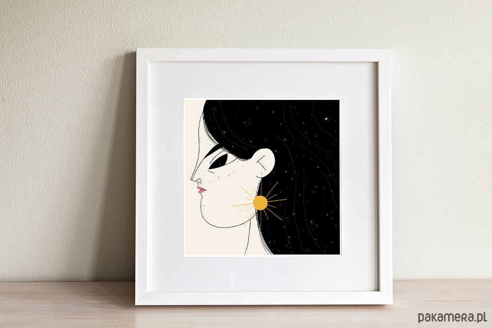 Portret kobiety z profilu, której wnętrze jest nieco kosmiczne.