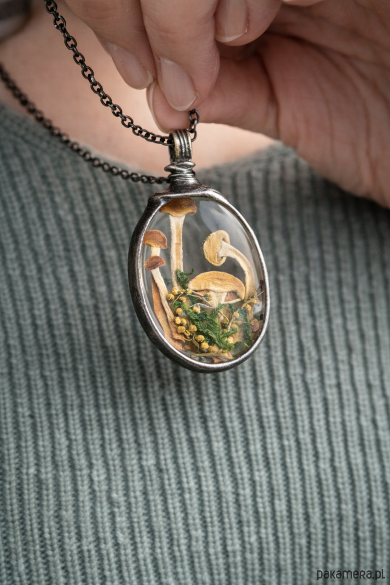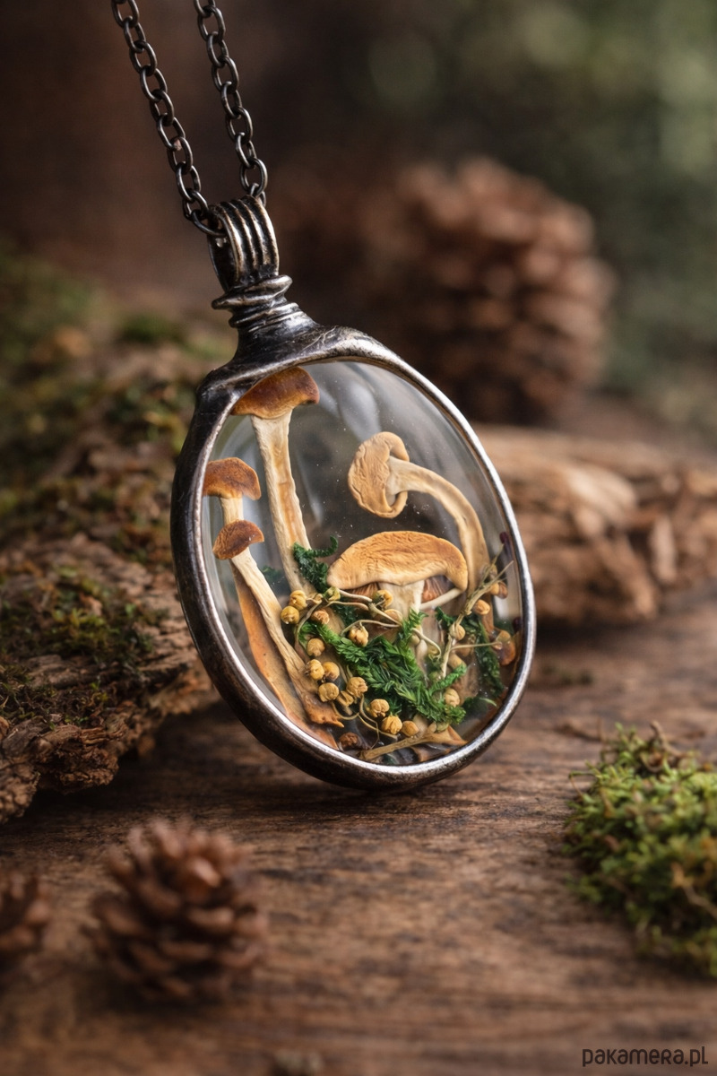 W środku znajdują się prawdziwe, suszone grzybki oraz delikatne leśne roślinki, ułożone w subtelnej, naturalnej harmonii. Każdy detal przypomina maleńki fragment lasu – cichy, spokojny i pełen uroku.