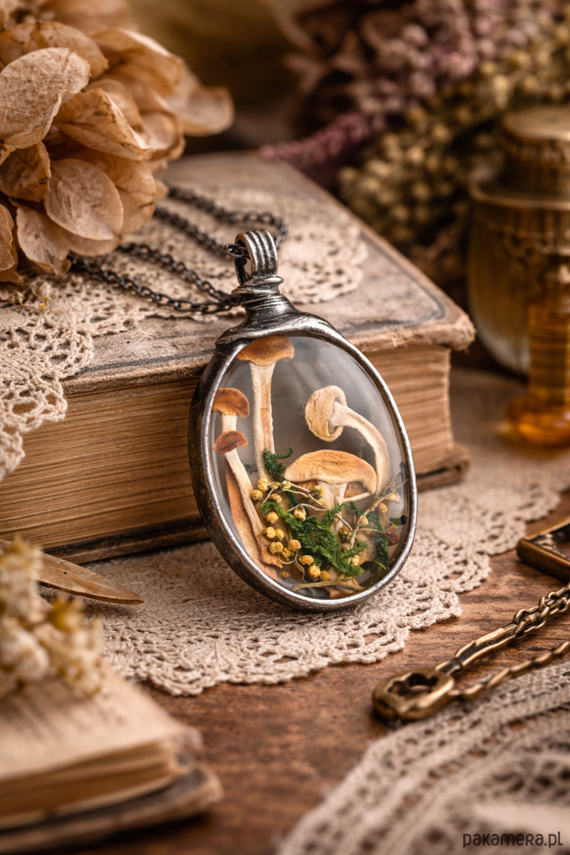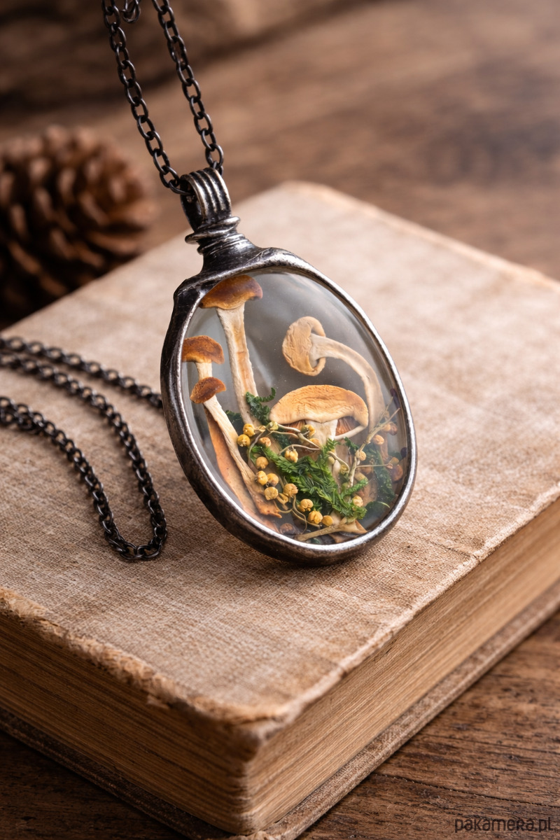 W środku znajdują się prawdziwe, suszone grzybki oraz delikatne leśne roślinki, ułożone w subtelnej, naturalnej harmonii. Każdy detal przypomina maleńki fragment lasu – cichy, spokojny i pełen uroku.