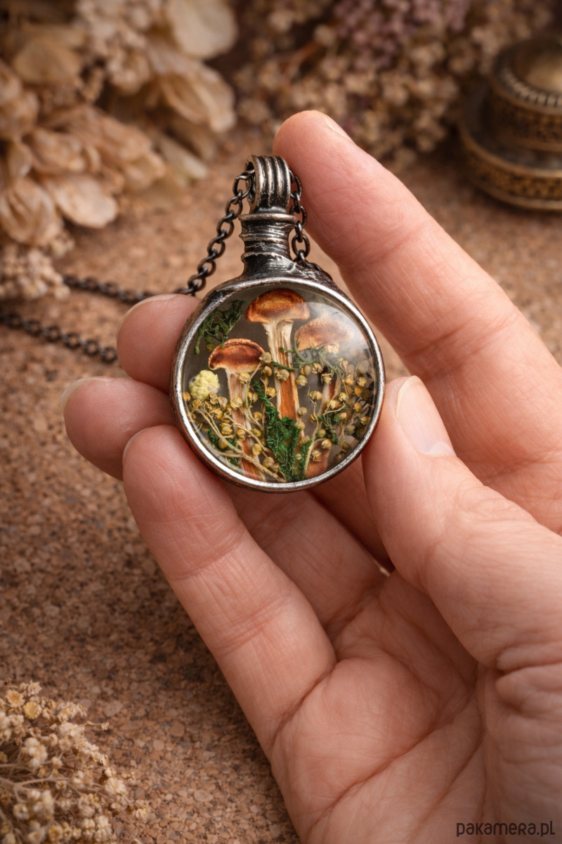 W środku znajdują się prawdziwe, suszone grzybki oraz delikatne leśne roślinki, ułożone w subtelnej, naturalnej harmonii. Każdy detal przypomina miniaturowy fragment lasu – cichy, spokojny i pełen uroku.