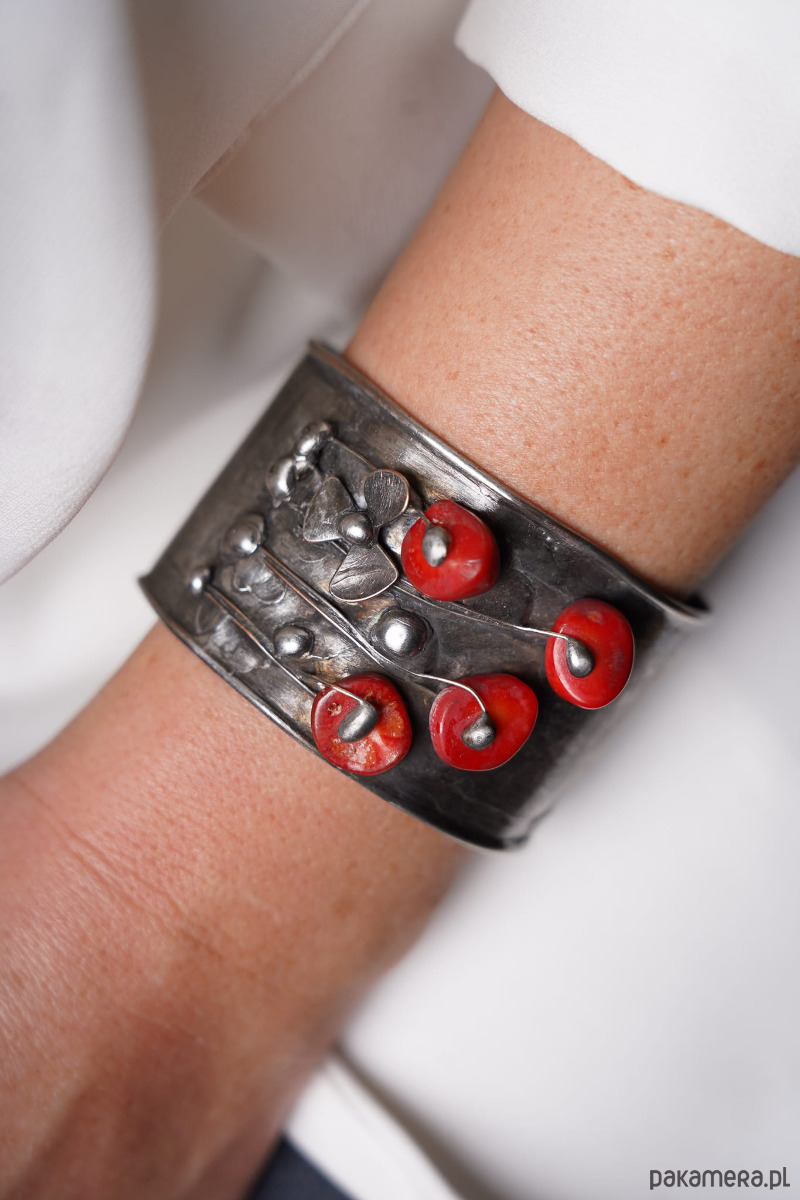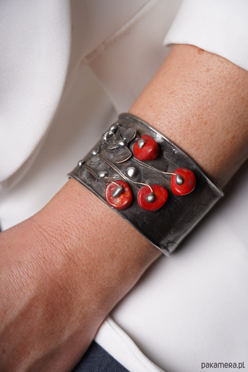 Bransoletka miedziana patynowana z koralem naturalnym .+wisior i kolczyki z koralem