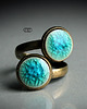 Efektowny pierścień z podwójnym ceramicznym oczkiem, ręcznie wykonanym z delikatnej, beżowej gliny kamionkowej, poszkliwionym mieszanką błękitnych błyszczących szkliw z wyraźnym efektem spękań. Obrączka regulowana w kolorze starego złota, średnica oczka ok 12mm. Polecam